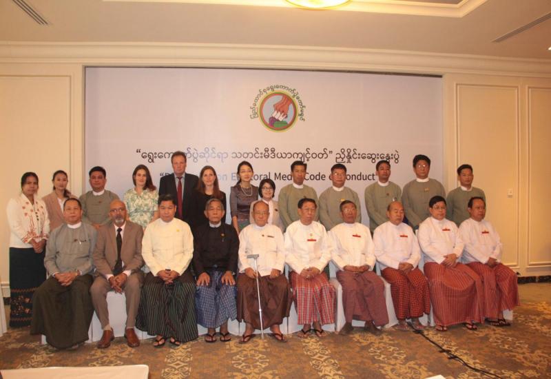 ပြည်ထောင်စုရွေးကောက်ပွဲကော်မရှင်နှင့် မြန်မာနိုင်ငံသတင်းမီဒီယာကောင်စီတို့ ပူးပေါင်း ၍ရွေးကောက်ပွဲဆိုင်ရာ သတင်းမီဒီယာ ကျင့်ဝတ်ပြုစုရေး ညှိနှိုင်းဆွေးနွေးပွဲကို ယနေ့နံနက် ၉ နာရီတွင် နေပြည်တော်ရှိ Hilton ဟိုတယ်၌ ကျင်းပရာ ပြည်ထောင်စု ရွေးကောက်ပွဲ ကော်မရှင်ဥက္ကဋ္ဌ ဦးလှသိန်းနှင့် ကော်မရှင်အဖွဲ့ဝင်များ၊ မြန်မာနိုင်ငံသတင်းမီဒီယာကောင်စီ ဥက္ကဋ္ဌ ဦးအုန်းကြိုင် (ဟံသာဝတီ ဦးအုန်းကြိုင်) နှင့် တာဝန်ရှိသူများ၊ကော်မရှင်ရုံးမှ တာဝန်ရှိသူများ၊International Institute for Democracy and Electoral Assistance (International IDEA) မှတာဝန်ရှိသူများ တက်ရောက်ကြသည်။