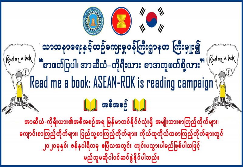 "စာဖတ်ပြပါ၊ အာဆီယံ-ကိုရီးယား စာအတူဖတ်စို့လား" အစီအစဉ်ကို မြန်မာတစ်နိုင်ငံလုံးရှိ တိုင်းဒေသကြီးနှင့် ပြည်နယ်အတွင်း အမျိုးသားစာကြည့်တိုက်များ၊ ကျောင်းစာကြည့်တိုက်များ၊ ပြည်သူ့စာကြည့်တိုက်များ၊ ကိုယ်ထူကိုယ်ထ စာကြည့်တိုက်များတွင် ဇန်နဝါရီ ၁၅ ရက်မှစ၍ ဧပြီလအထိ သာသနာရေးနှင့်ယဉ်ကျေးမှုဝန်ကြီးဌာနက ကြီးမှူးကျင်းပမည် ဖြစ်ကြောင်းသိရသည်။