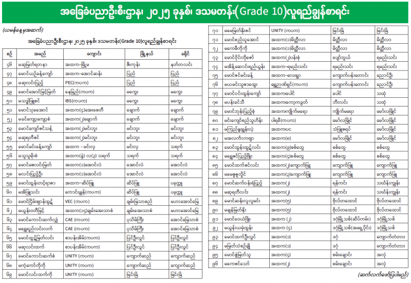 အခြေခံပညာဦးစီးဌာန၊ ၂၀၂၅ ခုနှစ်၊ ဒသမတန်း(Grade 10)လူရည်ချွန်စာရင်း