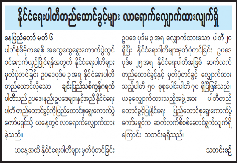 ပါတီစုံဒီမိုကရေစီအထွေထွေရွေးကောက်ပွဲတွင် ဝင်ရောက်ယှဉ်ပြိုင်ရန်အတွက် နိုင်ငံရေးပါတီများမှတ်ပုံတင်ခြင်း ဥပဒေပုဒ်မ ၃ အရ နိုင်ငံရေးပါတီတည်ထောင်လိုသော ချင်းပြည်သစ်ကွန်ဂရက်ပါတီသည် ဥပဒေ၊ နည်းဥပဒေများနှင့်အညီ နိုင်ငံရေးပါတီတည်ထောင်ခွင့်ကို ပြည်ထောင်စုရွေးကောက်ပွဲကော်မရှင်သို့ ယနေ့တွင် လာရောက်လျှောက်ထားခဲ့သည်။