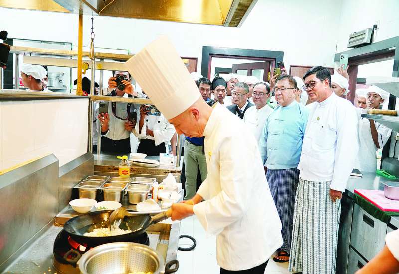 မြန်မာ - တရုတ် သံတမန်ထူထောင်ခြင်း (၇၅) နှစ်မြောက်အထိမ်းအမှတ်အဖြစ် ဟိုတယ်နှင့်ခရီးသွားလာရေးဝန်ကြီးဌာန မြန်မာ - တရုတ်ချစ်ကြည်ရေးအသင်း (မန္တလေး) နှင့် ဖူးကျင့်နိုင်ငံတကာဘာသာစကား သင်တန်းကျောင်းတို့ ပူးပေါင်း၍ Yunnan Economics Trade and Foreign Affairs College ၏ အကူအညီဖြင့် တရုတ်အစားအစာချက်ပြုတ်နည်းသင်တန်းဖွင့်ပွဲအခမ်းအနားကို ယနေ့မွန်းလွဲပိုင်းတွင် နေပြည်တော်ရှိ ရွှေစံအိမ်ဟိုတယ်၌ ကျင်းပပြုလုပ်ရာ ဟိုတယ်နှင့်ခရီးသွားလာရေးဝန်ကြီဌာန ပြည်ထောင်စုဝန်ကြီး ဦးကျော်စိုးဝင်း တက်ရောက်၍ အဖွင့်အမှာစကားပြောကြားသည်။
