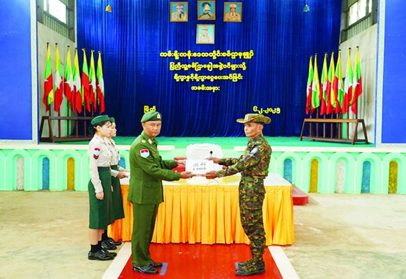 တနင်္သာရီတိုင်းဒေသကြီး မြိတ်မြို့နယ်ရှိ ပြည်သူ့စစ် (ဌာနေ) တပ်ဖွဲ့ဝင်များအား စားသောက်ဖွယ်ရာများနှင့် ဂုဏ်ပြုချီးမြှင့်ငွေများ ပေးအပ်ခြင်းကို ယနေ့နံနက်ပိုင်းတွင် မြိတ်မြို့ရှိ နယ်မြေခံတပ်ရင်းခန်းမ၌ပြုလုပ်ရာ ကမ်းရိုးတန်းဒေသတိုင်းစစ်ဌာနချုပ် တိုင်းမှူး ဗိုလ်မှူးချုပ် ကျော်ကျော်ဟန်နှင့် အဖွဲ့ဝင်များ၊ ပြည်သူ့စစ် (ဌာနေ) တပ်ဖွဲ့ဝင်များ တက်ရောက်ကြသည်။