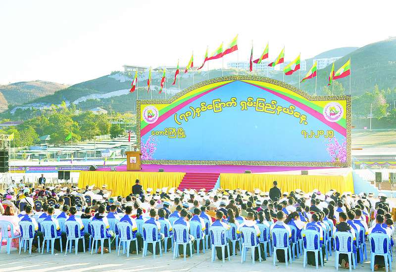(၇၈) နှစ်မြောက် ရှမ်းပြည်နယ်နေ့အခမ်းအနားကို ယနေ့နံနက်ပိုင်းတွင် တောင်ကြီးမြို့ အဝေရာမီးပုံးပျံကွင်း၌ကျင်းပရာ နိုင်ငံတော်စီမံအုပ်ချုပ်ရေးကောင်စီအဖွဲ့ဝင်၊ နယ်စပ်ရေးရာဝန်ကြီးဌာန ပြည်ထောင်စုဝန်ကြီး ဒုတိယဗိုလ်ချုပ်ကြီး ရာပြည့်နှင့် နိုင်ငံတော်စီမံအုပ်ချုပ်ရေးကောင်စီအဖွဲ့ဝင်များ တက်ရောက်ကြသည်။
