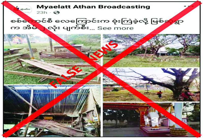 စစ်ကိုင်းတိုင်းဒေသကြီး မြောင်မြို့နယ် မြစ်ဆုံရွာကို ဖေဖော်ဝါရီ ၃ ရက်နေ့တွင် လုံခြုံရေးတပ်ဖွဲ့ဝင်များက လေကြောင်းမှ ဗုံးကြဲခဲ့သည့်အတွက် နေအိမ်နှစ်လုံးပျက်စီးခဲ့ကြောင်း တရားမဝင်ပြည်ဖျက်မီဒီယာများက မဟုတ်မမှန်ရေးသားဖြန့်ဝေနေသည်ကို တွေ့ရှိရသည်။