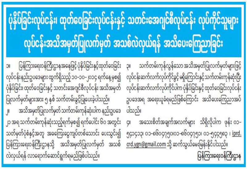 ပုံနှိပ်ခြင်းလုပ်ငန်း၊ ထုတ်ဝေခြင်းလုပ်ငန်းနှင့် သတင်းအေဂျင်စီလုပ်ငန်း လုပ်ကိုင်သူများ လုပ်ငန်းအသိအမှတ်ပြုလက်မှတ် အသစ်လဲလှယ်ရန် အသိပေးကြေညာခြင်း