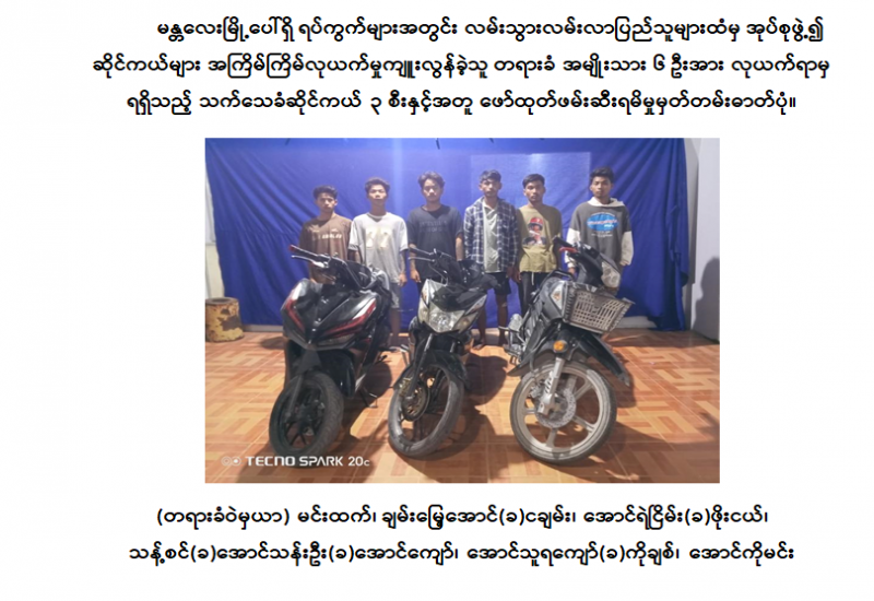 မန္တလေးမြို့ပေါ်ရှိ ရပ်ကွက်များအတွင်း ပြည်သူလူထုအထိတ်တလန့်ဖြစ်စေရန် ဖောက်ခွဲတိုက်ခိုက်မှုများကျူးလွန်ခြင်း၊ ဓားပြမှု၊ လုယက်မှုနှင့် ဒုစရိုက်မှုများကျူးလွန်ခြင်းတို့ မဖြစ်ပေါ်စေရေးအတွက် လုံခြုံရေးတပ်ဖွဲ့ဝင်များက လှည့်ကင်းဆောင်ရွက်ခြင်း၊ ပိတ်ဆို့စစ်ဆေးရှာဖွေခြင်း၊ ရှောင်တခင်ဧည့်စာရင်းစစ်ဆေးခြင်းများ ဆောင်ရွက်လျက်ရှိပြီး ဖြစ်ပွားခဲ့သည့် ပြစ်မှုများမှ တရားခံများအား ဖော်ထုတ်ဖမ်းဆီးရမိနိုင်ရေး နေ့၊ ညမပြတ်ကြိုးပမ်းဆောင်ရွက်လျက်ရှိသည်။