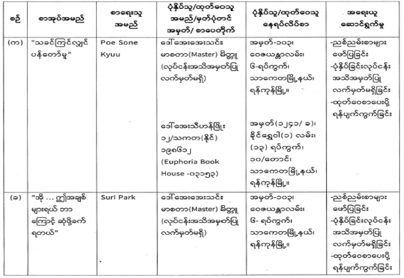 ၁။ ပြန်ကြားရေးဝန်ကြီးဌာနသည် ၂၀၁၄ ခုနှစ် ပုံနှိပ်ခြင်းနှင့်ထုတ်ဝေခြင်းလုပ်ငန်းဥပဒေ၊ နည်းဥပဒေများနှင့်အညီ ပုံနှိပ်ခြင်းလုပ်ငန်း၊ ထုတ်ဝေခြင်းလုပ်ငန်းများကို ကြီးကြပ်ဆောင်ရွက်လျက်ရှိပါသည်။ ထိုသို့ဆောင်ရွက်လျက်ရှိရာတွင် အောက်ဖော်ပြပါ ပုံနှိပ်သူနှင့်ထုတ်ဝေသူများသည် ပုံနှိပ်ခြင်းနှင့်ထုတ်ဝေခြင်းလုပ်ငန်းဥပဒေ ပုဒ်မ ၈၊ ပုဒ်မခွဲ(ဂ)ပါ ညစ်ညမ်းစာများကိုဖော်ပြခြင်း စည်းကမ်းချက်ကိုဖောက်ဖျက်၍ ဟီရိဩတ္တပ္ပကင်းသော၊ မြန်မာ့လူ့အဖွဲ့အစည်းက လက်မခံသော၊ လူငယ်များ၏ တွေးခေါ်မြော်မြင်မှုနှင့်ခံစားနားလည်မှုကို လွဲမှားစေနိုင်သော အကြောင်းအရာများကို ပုံနှိပ်၊ ထုတ်ဝေဖြန့်ချိခဲ့ကြောင်း တွေ့ရှိရပါသည်-