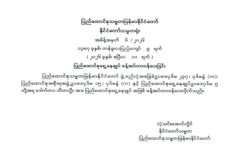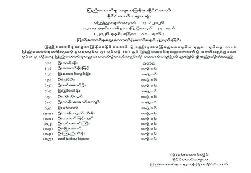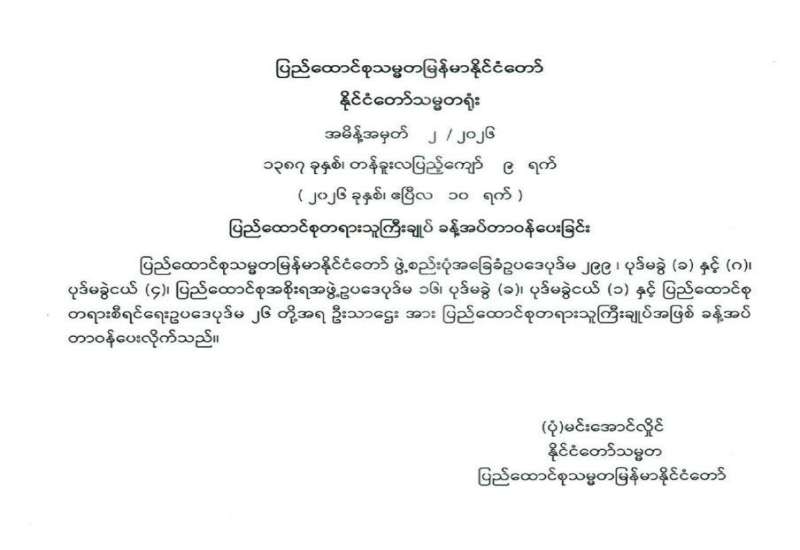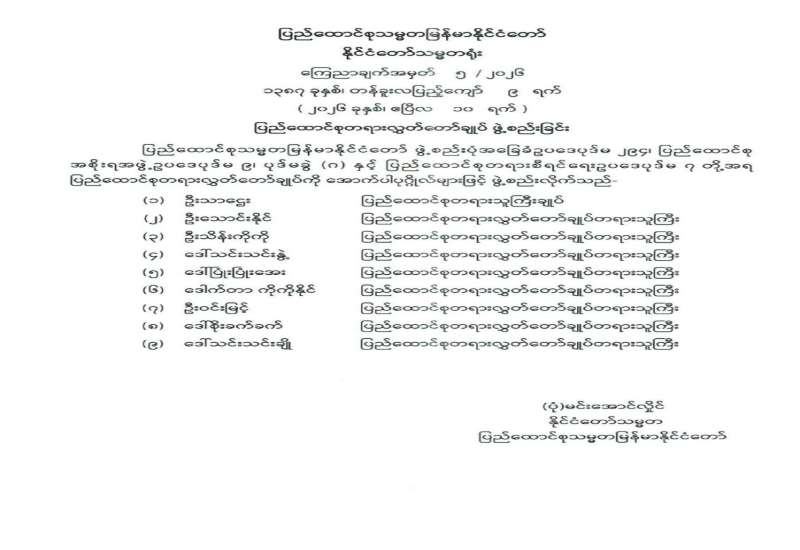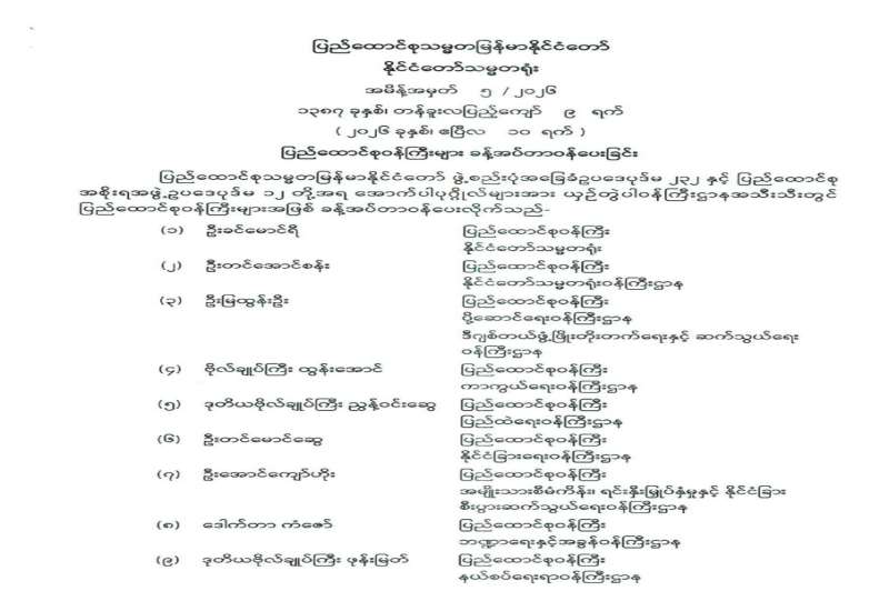 ပြည်ထောင်စုရွေးကောက်ပွဲကော်မရှင်ဥက္ကဋ္ဌ ခန့်အပ်တာဝန်ပေးခြင်း