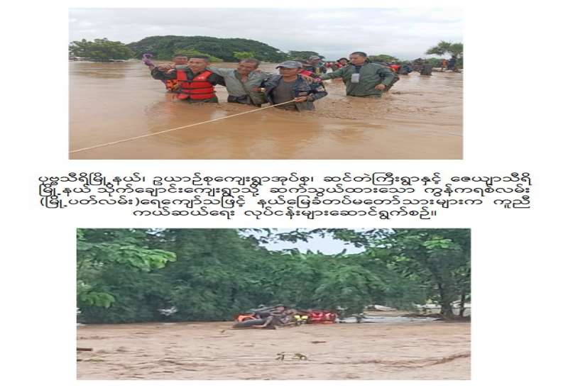 ပြည်ထောင်စုနယ်မြေ၊ နေပြည်တော် ဇေယျာသီရိမြို့နယ်၌ မိုးသည်းထန်စွာရွာသွန်းပြီး ဆင်သေချောင်းရေမြင့်တက်လာမှုကြောင့် ချောင်းဘေးရှိ ကျေးရွာများအတွင်း ရေများဝင်ရောက်ကာ ပိတ်မိနေသည့် ပြည်သူများအား ယနေ့ညနေပိုင်းတွင် ကယ်ဆယ်ရေးလုပ်ငန်းများ ဆောင်ရွက်လျက်ရှိကြောင်း သိရသည်။