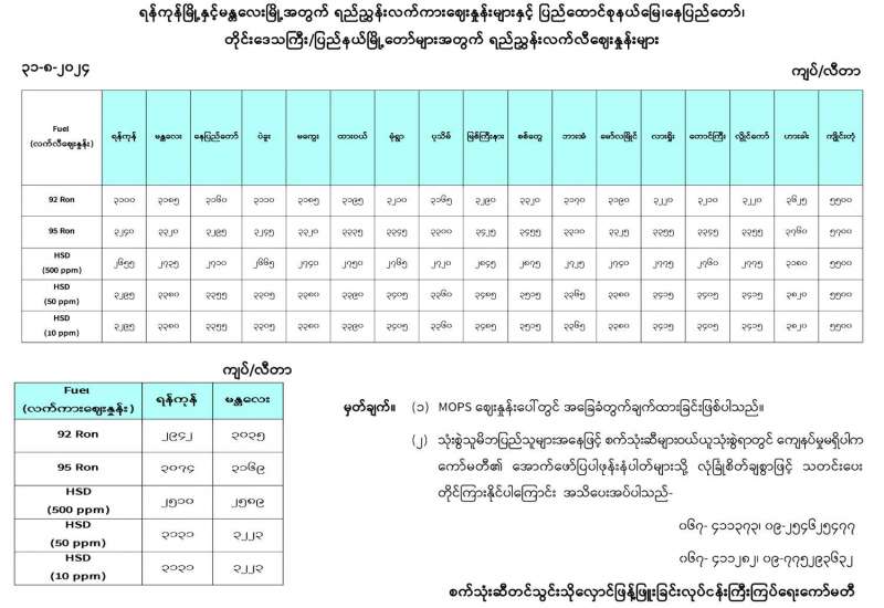 ရန်ကုန်မြို့နှင့် မန္တလေးမြို့အတွက် ရည်ညွှန်းလက်ကားဈေးနှုန်းများနှင့် ပြည်ထောင်စုနယ်မြေ နေပြည်တော်၊ တိုင်းဒေသကြီး/ပြည်နယ် မြို့တော်များအတွက် ရည်ညွှန်းလက်လီဈေးနှုန်းများ