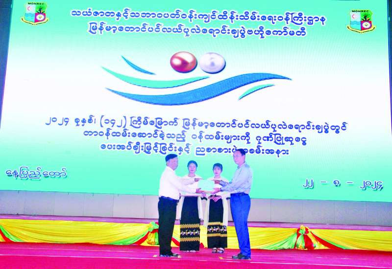 ၂၀၂၄ ခုနှစ် (၁၄၂) ကြိမ်မြောက် မြန်မာ့တောင် ပင်လယ်ပုလဲရောင်းချပွဲတွင် တာဝန်ထမ်းဆောင် ခဲ့သည့် ဝန်ထမ်းများအတွက် ဂုဏ်ပြုညစာစားပွဲ အခမ်းအနားကို ယနေ့ညနေပိုင်းတွင် နေပြည်တော်ရှိမဏိရတနာကျောက်စိမ်းခန်းမ၌ကျင်းပရာ (၁၄၂) ကြိမ်မြောက် မြန်မာ့တောင်ပင်လယ် ပုလဲရောင်းချပွဲဗဟိုကော်မတီနာယက သယံဇာတနှင့်သဘာဝပတ်ဝန်းကျင်ထိန်းသိမ်းရေးဝန်ကြီးဌာန ပြည်ထောင်စုဝန်ကြီး ဦးခင်မောင်ရီတက်ရောက်၍ ဂုဏ်ပြုအမှာစကား ပြောကြားသည်။