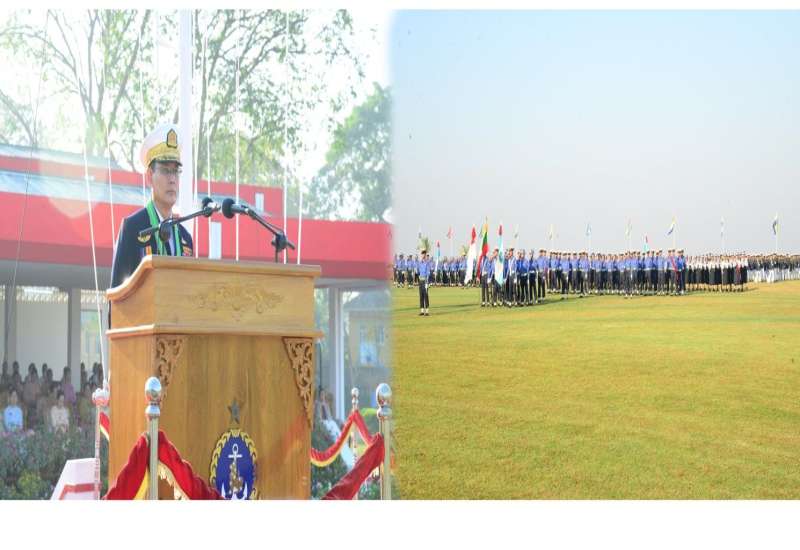 တပ်မတော် (ရေ) အရာရှိငယ် (စီမံခန့်ခွဲရေး) သင်တန်း အမှတ်စဉ် (၈၅)၊ တပ်မတော် (ရေ) အရာရှိငယ် (အင်ဂျင်နီယာ) သင်တန်း အမှတ်စဉ် (၅၉) နှင့် တပ်မတော် (ရေ) အမျိုးသမီးအရာရှိငယ်သင်တန်း အမှတ်စဉ် (၁၀) သင်တန်းဆင်းဂုဏ်ပြုစစ်ရေးပြအခမ်းအနားကို ယနေ့နံနက်ပိုင်းတွင် သန်လျင်တပ်နယ်ရှိ ရေတပ်လေ့ကျင့်ရေးဌာနချုပ် စစ်ရေးပြကွင်း၌ကျင်းပပြုလုပ်ရာ နိုင်ငံတော်လုံခြုံရေးနှင့်အေးချမ်းသာယာရေးကော်မရှင်ဥက္ကဋ္ဌ တပ်မတော်ကာကွယ်ရေးဦးစီးချုပ်ကိုယ်စား ကာကွယ်ရေးဦးစီးချုပ် (ရေ) ဗိုလ်ချုပ်ကြီး ဇေယျကျော်ထင်ထိန်ဝင်း တက်ရောက်မိန့်ခွန်းပြောကြားသည်။