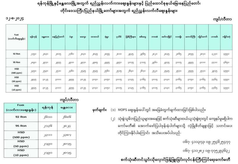 ရန်ကုန်မြို့နှင့် မန္တလေးမြို့အတွက် ရည်ညွှန်းလက်ကားဈေးနှုန်းများနှင့် ပြည်ထောင်စုနယ်မြေ နေပြည်တော်၊ တိုင်းဒေသကြီး/ပြည်နယ် မြို့တော်များအတွက် ရည်ညွှန်းလက်လီဈေးနှုန်းများ