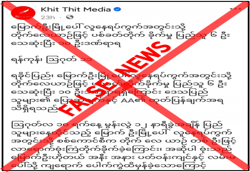 ရခိုင်ပြည်နယ်၊ မြောက်ဦးမြို့ပေါ် ရပ်ကွက်များအတွင်းသို့ ဩဂုတ်လ ၁၀ ရက်နေ့တွင် တပ်မတော်က တိုက်လေယာဉ်ဖြင့် ဗုံးကြဲတိုက်ခိုက်မှုကြောင့် ပြည်သူ ၆ ဦးသေဆုံးပြီး ၁၀ ဦး ထိခိုက်ဒဏ်ရာရရှိခဲ့သည်ဟု တရားမဝင်ပြည်ဖျက်မီဒီယာများက မဟုတ်မမှန် ရေးသားဖြန့်ဝေနေသည်ကို တွေ့ရှိရသည်။