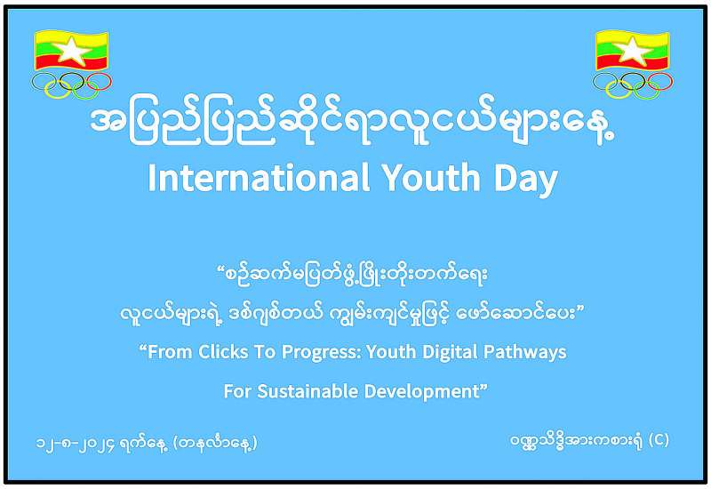 ၂၀၂၄ ခုနှစ်၊ အပြည်ပြည်ဆိုင်ရာ လူငယ်များနေ့အခမ်းအနားကို ယနေ့မွန်းလွဲပိုင်းတွင် နေပြည်တော်ရှိ ဝဏ္ဏသိဒ္ဓိအားကစားရုံ(C)၌ ကျင်းပပြုလုပ်ရာ နိုင်ငံတော်စီမံအုပ်ချုပ်ရေးကောင်စီဥက္ကဋ္ဌ နိုင်ငံတော်ဝန်ကြီးချုပ် ဗိုလ်ချုပ်မှူးကြီး မင်အောင်လှိုင် တက်ရောက်အမှာစကားပြောကြားသည်။
