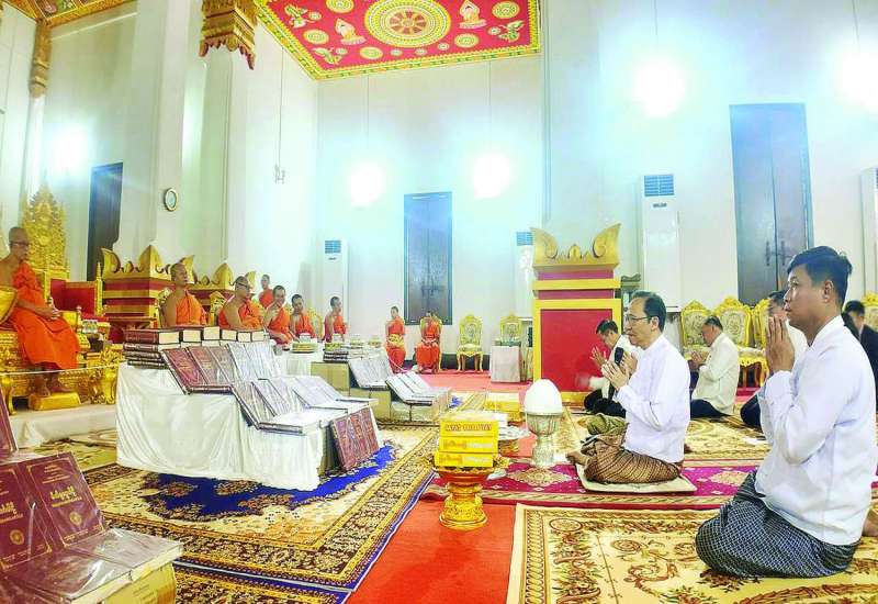ကျန်းမာရေးဝန်ကြီးဌာန ပြည်ထောင်စုဝန်ကြီး ဒေါက်တာသက်ခိုင်ဝင်းဦးဆောင်သည့် မြန်မာကိုယ်စားလှယ်အဖွဲ့သည် လာအိုနိုင်ငံဆိုင်ရာ မြန်မာသံအမတ်ကြီးဦးအောင်ကို၊ လာအိုနိုင်ငံဆိုင်ရာ မြန်မာစစ်သံ (ကြည်း၊ ရေ၊ လေ) ဗိုလ်မှူးချုပ် ခင်မောင်စိုးတို့နှင့်အတူ ယနေ့နံနက်ပိုင်းက လာအိုနိုင်ငံဗီယန်ကျင်းမြို့ Thatluang သံဃနာယကတိပိဋက ကျောင်းတိုက်၌ကျင်းပသော နိုင်ငံတော်စီမံအုပ်ချုပ်ရေးကောင်စီဥက္ကဋ္ဌ နိုင်ငံတော်ဝန်ကြီးချုပ် ဗိုလ်ချုပ်မှူးကြီးမင်းအောင်လှိုင်က ဆက်ကပ်လှူဒါန်းသည့် ဆဋ္ဌသင်္ဂါယနာမူ ပိဋကတ်သုံးပုံ ပါဠိတော်ကျမ်းများ လှူဒါန်းခြင်းအခမ်းအနားသို့ တက်ရောက်သည်။