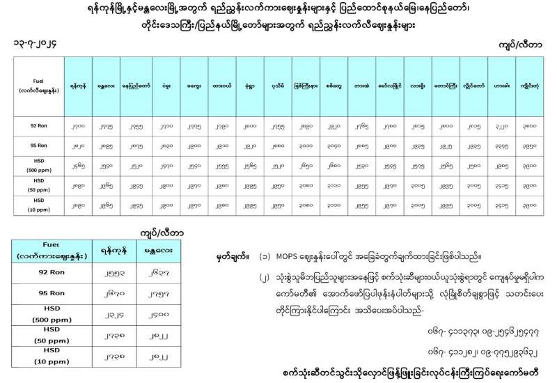 ရန်ကုန်မြို့နှင့် မန္တလေးမြို့အတွက် ရည်ညွှန်းလက်ကားဈေးနှုန်းများနှင့် ပြည်ထောင်စုနယ်မြေ နေပြည်တော်၊ တိုင်းဒေသကြီး/ ပြည်နယ် မြို့တော်များအတွက် ရည်ညွှန်းလက်လီဈေးနှုန်းများ