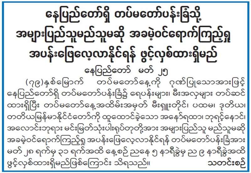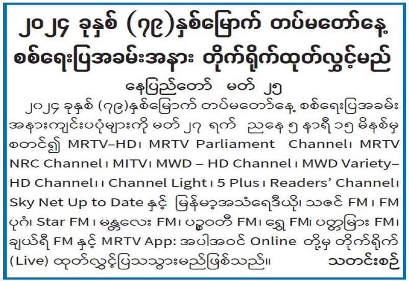 ၂၀၂၄ ခုနှစ် (၇၉)နှစ်မြောက် တပ်မတော်နေ့ စစ်ရေးပြအခမ်း အနားကျင်းပပုံများကို မတ် ၂၇ ရက် ညနေ ၅ နာရီ ၁၅ မိနစ်မှ စတင်၍ MRTV-HD ၊ MRTV Parliament Channel ၊ MRTV NRC Channel ၊ MITV ၊ MWD – HD Channel ၊ MWD Variety– HD Channel ၊ ၊ Channel Light ၊ 5 Plus ၊ Readers’ Channel ၊ Sky Net Up to Date နှင့် မြန်မာ့အသံရေဒီယို၊ သဇင် FM ၊ FM ပုဂံ၊ Star FM ၊ မန္တလေး FM ၊ ပဉ္စဝတီ FM ၊ ရွှေ FM၊ ပတ္တမြား FM ၊ ချယ်ရီ FM နှင့် MRTV App: အပါအဝင် Online တို့မှ တိုက်ရိုက် (Live) ထုတ်လွှင့်ပြသသွားမည်ဖြစ်သည်။