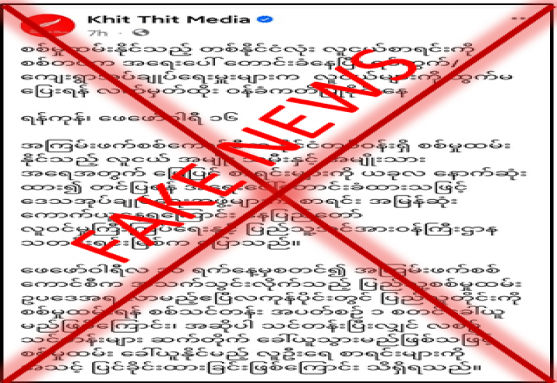 ရန်ကုန်၊ မန္တလေး အပါအဝင် တစ်နိုင်ငံလုံးမှ လက်ရှိချက်ချင်းစစ်မှုထမ်းရန် ဆင့်ခေါ်နိုင်သော လူဦးရေ ကျား၊ မစာရင်းကို အမြန်ဆုံးကောက်ယူခိုင်းထားကြောင်း၊ ပြည်နယ်/တိုင်းဒေသကြီးများရှိ ရပ်ကွက်အုပ်ချုပ်ရေးအဖွဲ့များက စစ်မှုထမ်းရန်အကျုံး ဝင်သောလူငယ်များကို ရှောင်တိမ်းခြင်းမရှိစေရန်အတွက် မိဘ၊ ဆွေမျိုး၊ မောင်နှမများကို ထောင်ဒဏ် ၃ နှစ်မှ ၅ နှစ် အထိချမှတ်နိုင်ကြောင်း ဝန်ခံကတိပြုလက်မှတ်များ ရေးထိုးခိုင်းနေကြောင်း မဟုတ်မမှန်သတင်းများကို တရားမဝင် ပြည်ဖျက်မီဒီယာ Khit Thit က လုပ်ကြံဝါဒဖြန့်ရေးသားလျက်ရှိပါသည်။