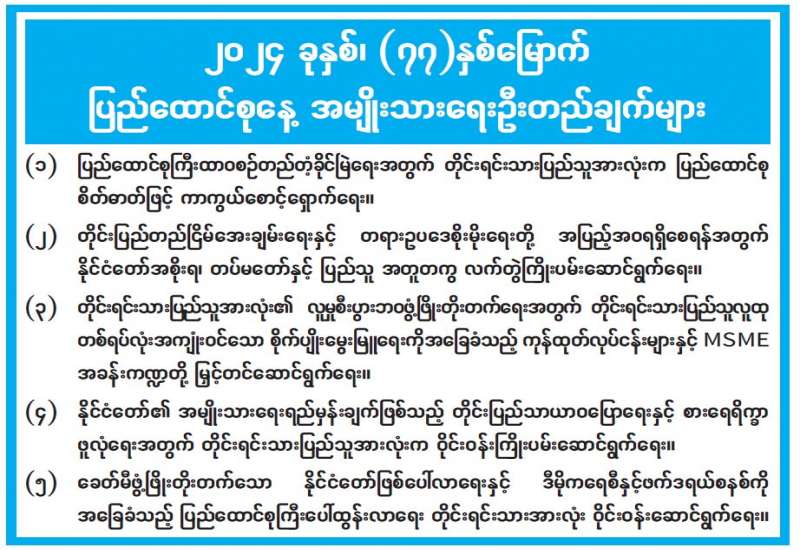 မြန်မာနိုင်ငံတွင် ကျေးလက်ဒေသ၌ နေထိုင်သူများက နိုင်ငံ့လူဦးရေ၏ သုံးပုံနှစ်ပုံခန့်ရှိသည်။ ကျေးလက်နေပြည်သူများ အလုပ်အကိုင်အခွင့်အလမ်းများရရှိရေး၊ မိသားစုဝင်ငွေတိုးပြီး လူမှုစီးပွားဘဝများ ဖွံ့ဖြိုးတိုးတက်ရေးတို့အတွက် စီမံကိန်းများ ချမှတ်အကောင်အထည်ဖော်လျက်ရှိပြီး နည်းပညာသင်တန်းများ ဖွင့်လှစ်သင်ကြားပေးခြင်းနှင့် ထူးချွန်သည့်သင်တန်းသား၊ သင်တန်းသူများကို လုပ်ငန်းများထူထောင်နိုင်ရန် လုပ်ငန်းသုံးပစ္စည်းများကိုပါပေးအပ်ခြင်းဖြင့် ကျေးလက်ဒေသများတွင် အသေးစားကုန်ထုတ်လုပ်ငန်းများ ပေါ်ထွက်လာစေရန် နိုင်ငံတော်ကဆောင်ရွက်ပေးလျက်ရှိသည်။