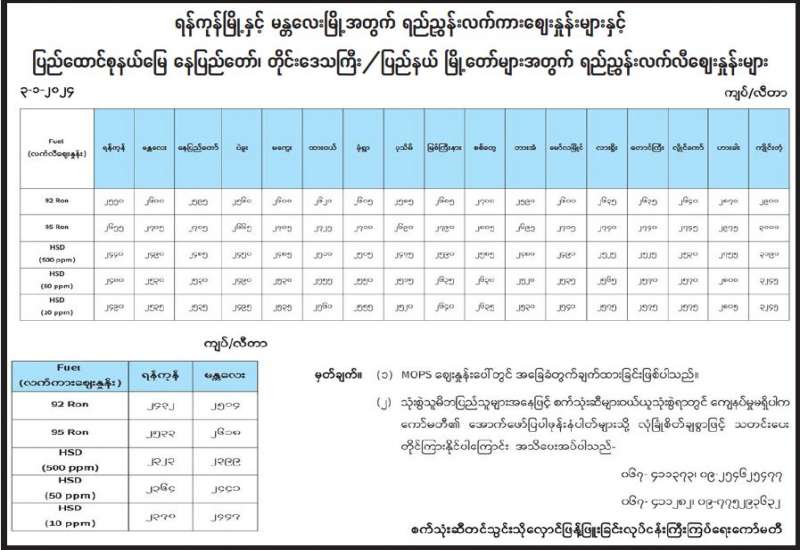 ရန်ကုန်မြို့နှင့် မန္တလေးမြို့အတွက် ရည်ညွှန်းလက်ကားဈေးနှုန်းများနှင့် ပြည်ထောင်စုနယ်မြေ နေပြည်တော်၊ တိုင်းဒေသကြီး/ပြည်နယ် မြို့တော်များအတွက် ရည်ညွှန်းလက်လီဈေးနှုန်းများ