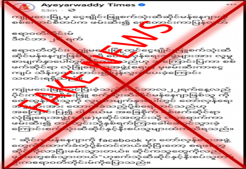 ဧရာဝတီတိုင်းဒေသကြီး၊ ကျုံမငေးမြို့မှ ငွေဗျိုင်းဖြူစက်သုံးဆီဆိုင်မန်နေဂျာကို လူမှုကွန်ရက်စာမျက်နှာပေါ်တွင် အကြမ်းဖက်သောင်းကျန်းသူများအား ထောက်ခံသည့် စာသားများရေးသားသည်ဟု အကြောင်းပြ၍ ဒီဇင်ဘာ ၂၂ ရက်နေ့တွင် လုံခြုံရေးတပ်ဖွဲ့ဝင်များက ဖမ်းဆီးခဲ့ပြီး ငွေကျပ် သိန်း ၄၀ တောင်း၍ ပြန်လွှတ်ပေးခဲ့ကြောင်း သတင်းတု၊ သတင်းအမှားများကို Ayeyarwaddy Times က လူမှုကွန်ရက်စာမျက်နှာတွင် ရေးသားဖြန့်ဝေလျက်ရှိသည်ကို တွေ့ရှိရပါသည်။