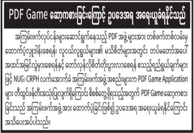 အကြမ်းဖက်အုပ်စုအဖြစ် ကြေညာထားသော CRPH ၊ NUG နှင့် ယင်းတို့၏ လက်ဝေခံအဖွဲ့အစည်းများ၊ ယင်းတို့နှင့် ဆက်နွှယ်နေသော အဖွဲ့အစည်းများ၊ လူပုဂ္ဂိုလ်များသည် နိုင်ငံတော်တည်ငြိမ်အေးချမ်းရေးကို ပျက်ပြားစေရန်နှင့် ပြည်သူလူထုကို အကြောက်တရားများ ဖြစ်ပေါ်စေပြီး အစိုးရယန္တရားများပျက်ပြားစေရန် ရည်ရွယ်လျက် လှုံ့ဆော်ခြင်း၊ ဝါဒဖြန့်ခြင်း၊ ခြိမ်းခြောက်ခြင်းများကို လူမှုကွန်ရက်များမှတစ်ဆင့် နည်းမျိုးစုံဖြင့် ပြုလုပ်လျက်ရှိသည်။