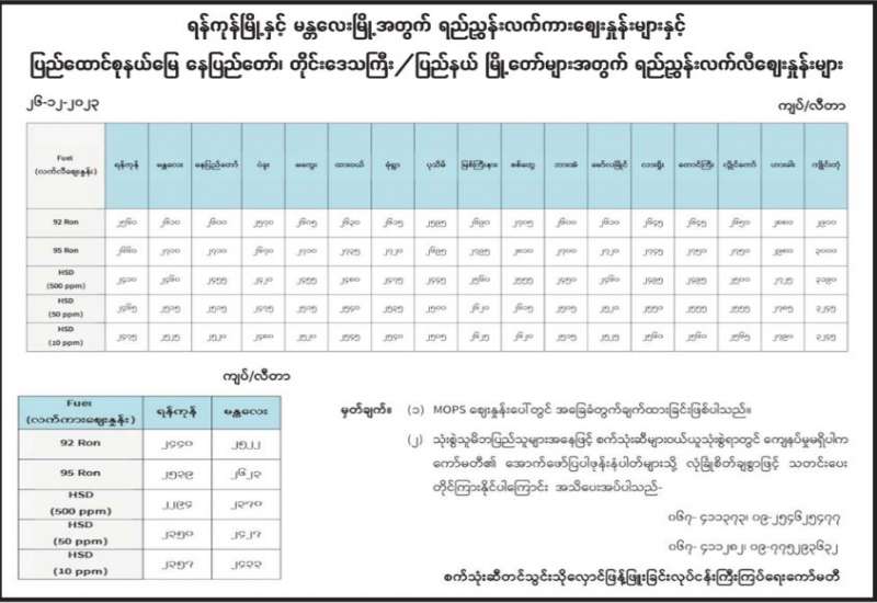 ရန်ကုန်မြို့နှင့် မန္တလေးမြို့အတွက် ရည်ညွှန်းလက်ကားဈေးနှုန်းများနှင့် ပြည်ထောင်စုနယ်မြေ နေပြည်တော်၊ တိုင်းဒေသကြီး/ပြည်နယ် မြို့တော်များအတွက် ရည်ညွှန်းလက်လီဈေးနှုန်းများ