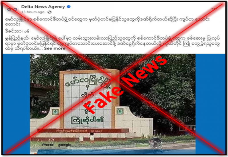 မွန်ပြည်နယ်၊ မော်လမြိုင်မြို့ပေါ်မှာ လမ်းသွားလမ်းလာပြည်သူတွေကို တပ်ဖွဲ့တွေက စစ်ဆေးမှုပြုလုပ်ရာမှာ မှတ်ပုံတင်မပြနိုင်ရင် ငွေကျပ်တစ်သောင်းပေးဆောင်ဖို့ ဒဏ်ငွေရိုက်နေသည်ဟု တရားမဝင်ပြည်ဖျက်မီဒီယာ တစ်ခုဖြစ်တဲ့ Delta News Agency က မဟုတ်မမှန်ကောလာဟလ သတင်းများကို လူမှုကွန်ရက်စာမျက်နှာတွင် ရေးသားဖြန့်ဝေလျက်ရှိသည်ကို တွေ့ရှိရပါသည်။