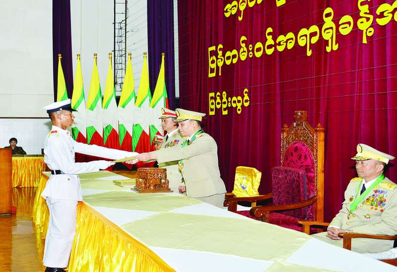 စစ်တက္ကသိုလ် ဗိုလ်လောင်းသင်တန်းအမှတ်စဉ် (၆၅) သင်တန်းဆင်း ဂုဏ်ပြုညစာ စားပွဲအခမ်းအနားကို ယနေ့ညနေပိုင်းတွင် ပြင်ဦးလွင်မြို့ စစ်တက္ကသိုလ် အနော်ရထာတပ်ရင်း ဗိုလ်လောင်းစားရိပ်သာ၌ ကျင်းပပြုလုပ်ရာ နိုင်ငံတော်စီမံအုပ်ချုပ်ရေးကောင်စီဥက္ကဋ္ဌ တပ်မတော်ကာကွယ်ရေးဦးစီးချုပ် ဗိုလ်ချုပ်မှူးကြီး မင်းအောင်လှိုင် တက်ရောက်ချီးမြှင့်သည်။