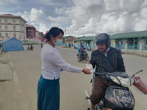 ကချင်ပြည်နယ် ၊ ဗန်းမော်ခရိုင် ရွှေကူမြို့နယ် မီးသတ်ဦးစီးဌာနမှ ပြည်သူများအား ကိုဗစ်−၁၉ ရောဂါကူးစက်ခြင်းမှ ကာကွယ်နိုင်ရန်အတွက် ရည်ရွယ်၍ အောက်တိုဘာလ ၉ ရက် ၊ နံနက် ၉ နာရီအချိန်တွင် လူစည်ကားရာဖြစ်သော လမ်းဆုံနေရာ၌ နှာခေါင်းစည်း(Mask)များ အခမဲ့ဖြန့်ဝေခြင်းနှင့် အသိပညာပေးခြင်းလုပ်ငန်းများ ဆောင်ရွက်ခဲ့သည်။