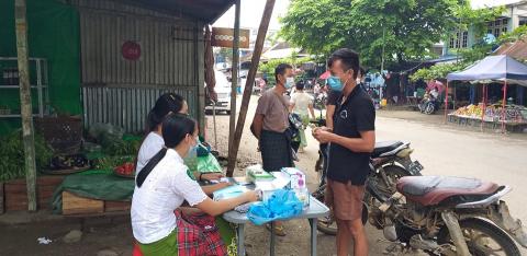 ကချင်ပြည်နယ် ၊ ဗန်းမော်ခရိုင် ၊ မိုးမောက်မြို့နယ် အလင်းကောင်ရပ်ကွက် မြို့မစျေးရှေ့တွင် ကိုဗစ်-၁၉ ကပ်ရောဂါ ကူးစက်ပြန့်ပွားမှုမရှိစေရေးအတွက် ကိုဗစ်-၁၉ စစ်ဆေး ရေးအဖွဲ့မှ ရှောင်တခင်စစ်ဆေးခဲ့ပြီး Mask တပ်ဆင်ခြင်းမရှိဘဲ လမ်းပေါ်သွားလာသူများကို Mask (၃)ခုစီ ပေး၍ ဒဏ်ငွေ(၃၀၀၀)ကျပ် ပေးဆောင်စေခြင်းကို ယနေ့နံနက် (၁၀)နာရီမှမွန်းတည့် (၁၂)နာရီအထိ ဆောင်ရွက်ခဲ့သည်။