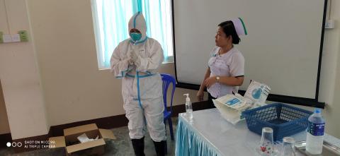 COVID-19ဗိုင်းရပ်စ်ကာကွယ်ရေးဝတ်စုံ(PPE) အသုံးပြုဝတ်ဆင်နည်း တနင်္သာရီမြို့နယ် ကျန်းမာရေးဝန်ထမ်းများအား အသိပညာပေး သရုပ်ပြ
