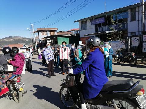 ကချင်ပြည်နယ်၊ ဗန်းမော်ခရိုင်၊ ဒေါ့ဖုန်းယန်မြို့တွင် ကိုဗစ်-၁၉ ရောဂါကာကွယ် ထိန်းချုပ်ရေး လုပ်ငန်းများ အရှိန်အဟုန်မပျက် ဆက်လက်ဆောင်ရွက်လျက်ရှိရာ ပြည်သူများ လူစုလူဝေး နှင့် ဈေးသို့သွားရောက်ပါက နှာခေါင်းစည်း MasK များကို တပ်ဆင်ပြီးမှ သွားလာနိုင်ရန် ရည်ရွယ်၍ MasK များ အခမဲ့ဖြန့်ဝေခြင်းကို ယမန်နေ့ နံနက် ၇ နာရီတွင် မြို့ပေါ်ရပ်ကွက်ဈေး နှင့် လူစည်ကားရာ နေရာများတွင် ဖြန့်ဝေဆောင်ရွက်သည်။