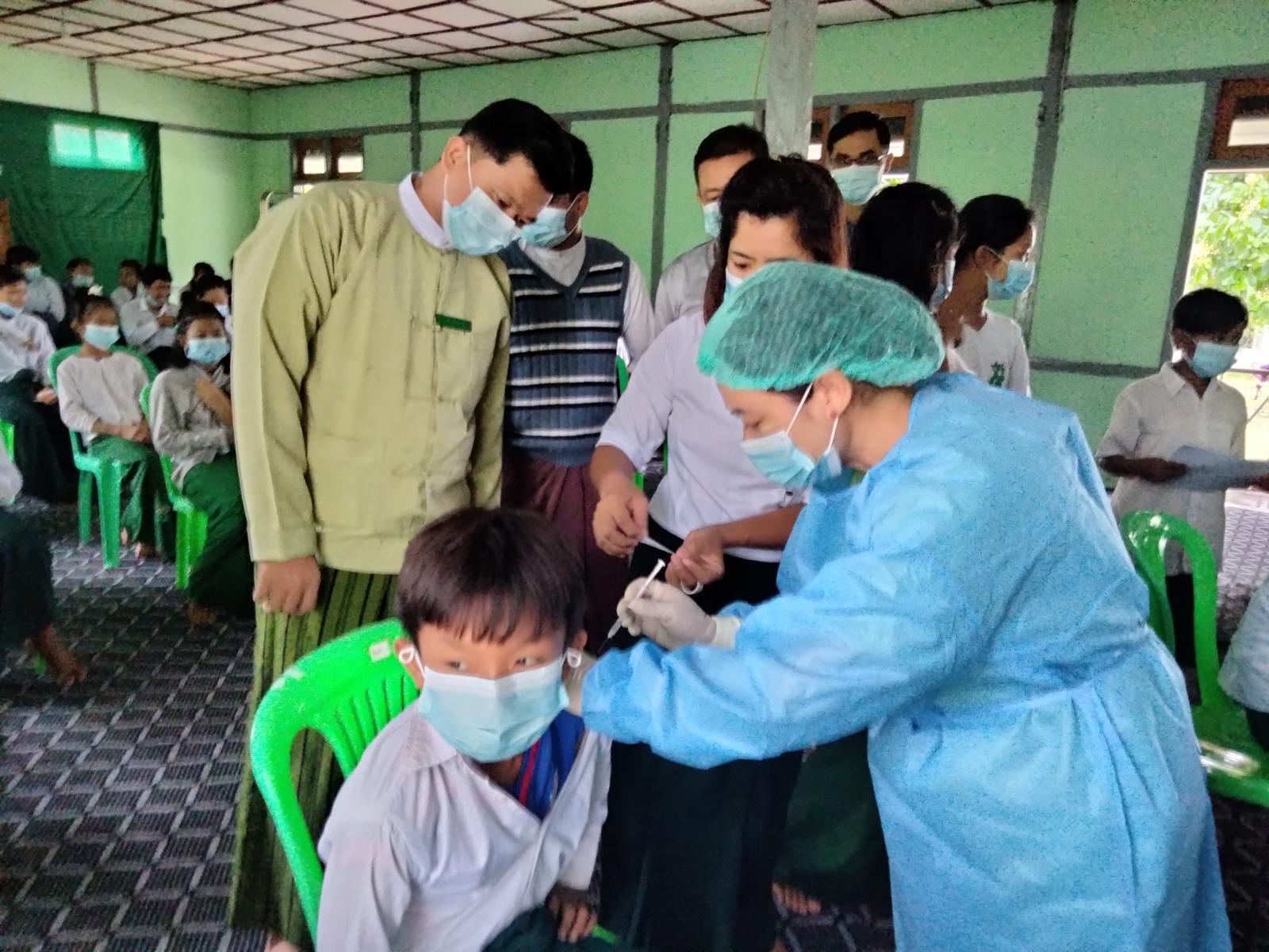 ထို့နောက် မြို့နယ်ကျန်းမာရေးဌာနမှ အထက်တန်းသူနာပြု ဆရာမဒေါ်နန်းဝင်းကြည်နှင့် ကျန်းမာရေးဆရာမများ၊ ကျန်းမာရေးဝန်ထမ်းများက အသက် ၅ နှစ်မှ ၁၂ နှစ်အထိ ကျောင်းသား၊ ကျောင်းသူများ၊ အသက် ၁၂ နှစ်မှ ၁၈ နှစ်အထိ ကျောင်းသား၊ ကျောင်းသူများကို ဒုတိယအကြိမ်အဖြစ် ကိုဗစ်ကာကွယ်ဆေး Sinovac ကို ထိုးနှံပေးရာ ကျောင်းအုပ်ဆရာမကြီးနှင့် ဆရာ၊ ဆရာမများ၊ အထွေထွေအုပ်ချုပ်ရေးဦးစီးဌာန ဝန်ထမ်းများ၊ ဂရုဏာရှင် လူမှုကူညီရေးအသင်းတို့မှ ပူးပေါင်းဆောင်ရွက်ပေးခဲ့ကြောင်း သိရသည်။