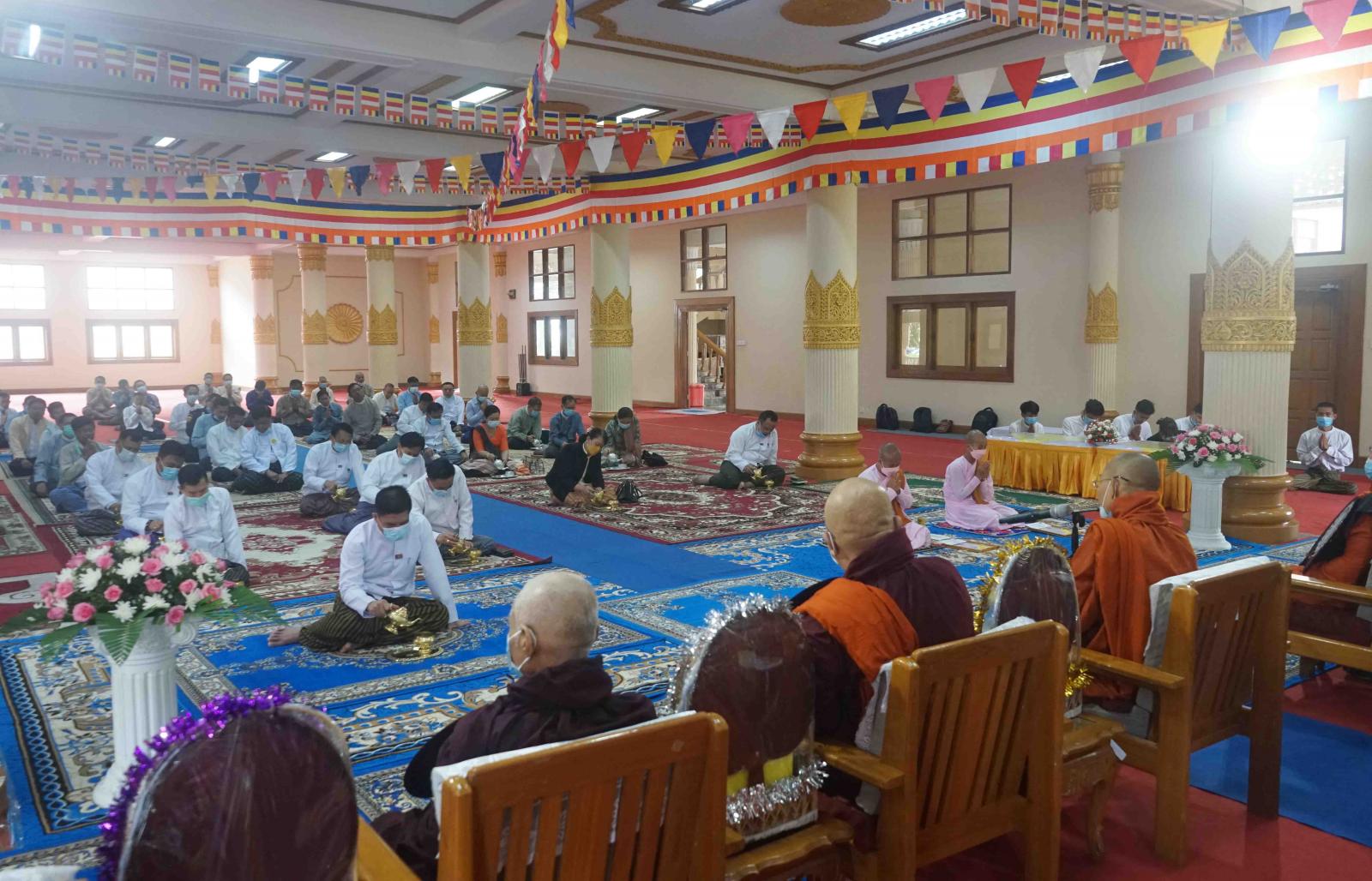 ရှေးဦးစွာ အခမ်းအနားသို့ ကြွရောက်လာကြသည့် ဆရာတော်သံဃာတော်များ၊ ပြည်နယ်ဝန်ကြီးချုပ်နှင့် ဧည့်ပရိတ်သတ်များက “နမောတဿ” သုံးကြိမ်ရွတ်ဆို ဘုရားကန်တော့၍ မင်္ဂလာအခမ်းအနားကို စတင်ဖွင့်လှစ်ခဲ့ပြီး ပြည်နယ်သံဃနာယကအဖွဲ့ဥက္ကဋ္ဌ၊ လွိုင်ကော်မြို့၊ ကျောင်းထိုင်ဘုန်းကြီး သင်တန်းကျောင်း ဆရာတော် ဘဒ္ဒန္တပညာစက္က (မဟာဂန္တဝါစကပဏ္ဍိတ၊ အဂ္ဂမဟာသဒ္ဓမ္မဇောတိကဓဇ) အရှင်သူမြတ်ထံ ငါးပါးသီလ ခံယူဆောက်တည်ခဲ့ကြသည်။