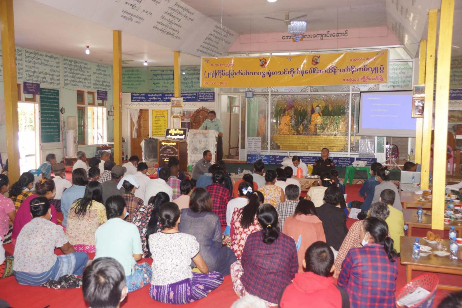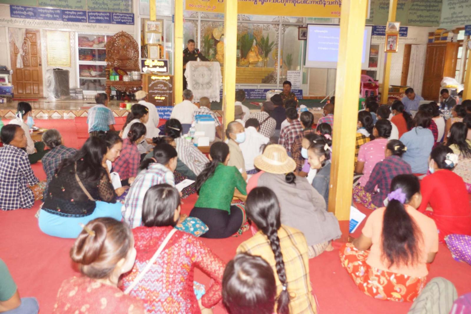 ကွင်းဆင်းဆောင်ရွက်ခြင်းကို ယနေ့နံနက် (၉)နာရီမှစတင်၍ ဧက(၅ဝဝ)ရပ်ကွက် ဘုန်းကြီးကျောင်းတွင် ပြုလုပ်ခဲ့ပြီး ဦးစွာ ခရိုင်စီမံအုပ်ချုပ်ရေးအဖွဲ့ဝင် ဒုတိယဗိုလ်မှူးကြီး ဇော်မိုးထွန်းမှ ဒေသနေပြည်သူများ၏ ပညာရေး၊ ကျန်မာရေး၊ လူမှုရေးစသည့် ဖွံ့ဖြိုးတိုးတက်မှုများ အတွက် ဌာနဆိုင်ရာများ စုပေါင်း၍ ပြည်သူ့အကျိုးပြု လုပ်ငန်းဆောင်ရွက်ရန် ကွင်းဆင်း လာရောက်ခြင်း ဖြစ်ပါကြောင်း၊ ပြည်သူလူထုများမှလည်း မိမိတို့၏ လိုအပ်ချက်များနှင့် စပ်လျဉ်း၍ ပါဝင်ဆွေးနွေးပေးကြစေလိုကြောင်းနှင့် သက်ဆိုင်ရာဌာနများမှ လိုအပ်ချက်အလိုက် ပေါင်းစပ် ဆောင်ရွက်ပေးသွားမည်ဖြစ်ကြောင်းကို ပြောကြားခဲ့သည်။ ဆက်လက်၍ မြို့နယ်စီမံအုပ်ချုပ်ရေး အဖွဲ့ ဉက္ကဋ္ဌ ဦးမျိုးကျော် က နိုင်ငံရေး ဖြစ်စဉ်အဆင့်ဆင့် ပြောင်းလဲလာမှု အခြေအနေများကို လည်းကောင်း၊ စစ်ကြောင်းကြီး (၅)ကြောင်းတွင် ပါဝင်သော ဌာနဆိုင်ရာအသီးသီးမှ ပြည်သူလူထုနှင့် ဒေသဖွံ့ဖြိုးတိုးတက်ရေးအတွက် ဆောင်ရွက်သွားမည့် လုပ်ငန်းစဉ်များအား လည်းကောင်း အသေးစိတ်ရှင်းလင်း ဆွေးနွေးခဲ့သည်။