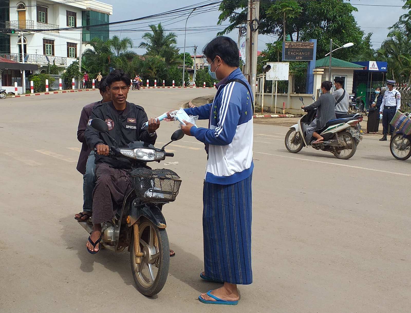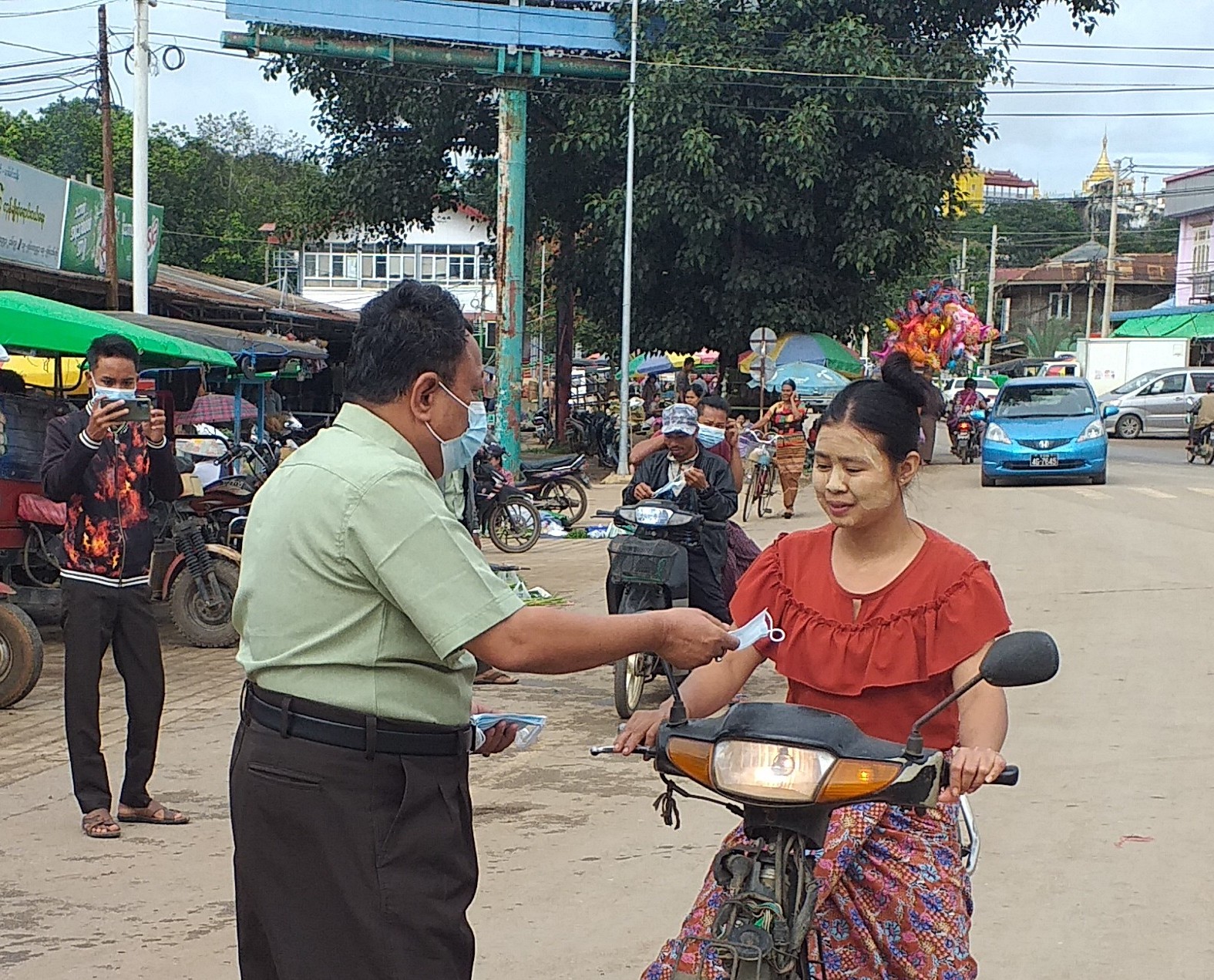 အဆိုပါကိုဗစ်-၁၉ ရောဂါကာကွယ်ရေးဆိုင်ရာ သတိပေးနှိုးဆော်မှုနှင့် နှာခေါင်းစည်း (Mask)များ အခမဲ့ဖြန့်ဝေခြင်းကို မြို့နယ်စီမံအုပ်ချုပ်ရေးကောင်စီဥက္ကဋ္ဌ၊ မြို့နယ်ကိုဗစ်-၁၉ ရောဂါထိန်းချုပ်ရေးနှင့်အရေးပေါ်တုံ့ပြန်ရေးကော်မတီဥက္ကဋ္ဌ ဦးမျိုးကျော်နှင့်ကော်မတီအဖွဲ့ဝင် မြို့နယ်အဆင့်ဌာနဆိုင်ရာများ၊ လူမှုရေးအသင်းအဖွဲ့တို့ပူးပေါင်း၍ “အပြင်ထွက်ပါက နှာခေါင်းစည်း (Mask)များကို တပ်ဆင်ကြရန်၊ ကိုဗစ်-၁၉ ရောဂါကာကွယ်ရေးနည်းလမ်းများနှင့်အညီ သွားလာ နေထိုင်ကြရန်နှင့် တစ်ဦးတစ်ယောက်ချင်းစီအလိုက် မိမိတို့၏ကျန်းမာရေး အသိစိတ်များနှင့်အညီ ရောဂါကူးစက်မှုမရှိရေး သတိပြုနေထိုင်ကြရန်”အစရှိသည့် ကျန်းမာရေးဝန်ကြီးဌာန၏ သတိပေး နှိုးဆော်မှုများကို Hand Speaker ဖြင့် အသိပေးနှိုးဆော်ခဲ့ပြီး ဈေးသွားဈေးလာ ပြည်သူများကို နှာခေါင်းစည်း(Mask) ၂၅၀၀ ခုအား အခမဲ့ဖြန့် ဝေပေးခဲ့ကြောင်းနှင့် ကိုဗစ်-၁၉ ရောဂါကာကွယ်ရေးဆိုင်ရာ သတိပေးနှိုးဆော်မှုများကို စဉ်ဆက်မပြတ် ဆက်လက်ဆောင်ရွက်သွားမည်ဖြစ်ကြောင်း သိရှိရသည်။