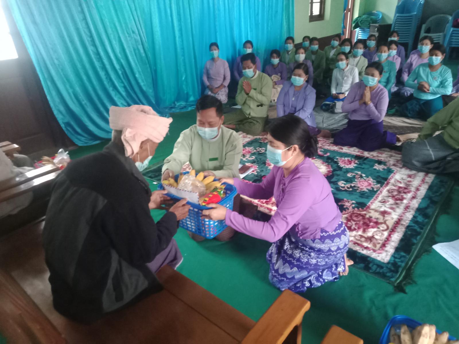 ရှေးဦးစွာ အသက် (၈၅)နှစ်နှင့်အထက် သက်ကြီးဘိုးဘွားများအား ပူဇော်ကန်တော့ချိုးဖြင့် ကန်တော့ကြပြီးနောက် လှူဘွယ် အာဟာရပစ္စည်းများနှင့် လှူဒါန်းငွေများကို ခရိုင်အုပ်ချုပ်ရေးမှူး ဦးကံစောလှိုင်နှင့်ဇနီး၊ မြို့နယ်အုပ်ချုပ်ရေးမှူး ဦးသိန်းထွဋ်နှင့်ဇနီး၊ အမျိုးသမီးရေးရာနှင့် မိခင်ကလေးအဖွဲ့ဝင်များ၊ တာဝန်ရှိသူများက လှူဒါန်းကြသည်။ ယင်းနောက် ကန်တော့ခံသက်ကြီးဘိုးဘွားများကိုယ်စား အဘိုးတစ်ဦးက ဆုတောင်းစကား ပြန်လည်ပြောကြားခဲ့သည်။
