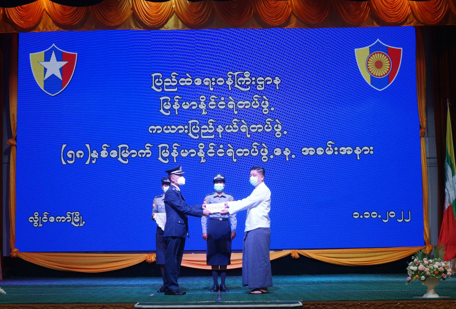ထို့နောက် ကယားပြည်နယ်ရဲတပ်ဖွဲ့မှူး၊ ရဲမှူးကြီး မောင်မောင်ဦးက မြန်မာနိုင်ငံရဲတပ်ဖွဲ့၊ ရဲချုပ်၏ သဝဏ်လွှာအား ဖတ်ကြားခဲ့ပြီး ပြည်နယ်ဝန်ကြီးချုပ်က ရဲတပ်ဖွဲ့ဝင်များ သက်သာချောင်ချိရေးအတွက် ထောက်ပံ့ငွေကျပ်သိန်း (၁၀၀)အားလည်းကောင်း၊ ရဲသူရဘွဲ့တံဆိပ်ဆုရရှိသည့် ရဲတပ်ဖွဲ့ဝင်(၁)ဦးအား ဂုဏ်ပြုဆုကိုလည်းကောင်း၊ လူသတ်မှုမှ တရားခံများ ဖော်ထုတ်ဖမ်းဆီးနိုင်ခဲ့သည့် ရဲတပ်ဖွဲ့ဝင်များအား ဂုဏ်ပြုဆုငွေကျပ်(၅)သိန်းအားလည်းကောင်း ချီးမြှင့်ပေးအပ်ခဲ့သည်။