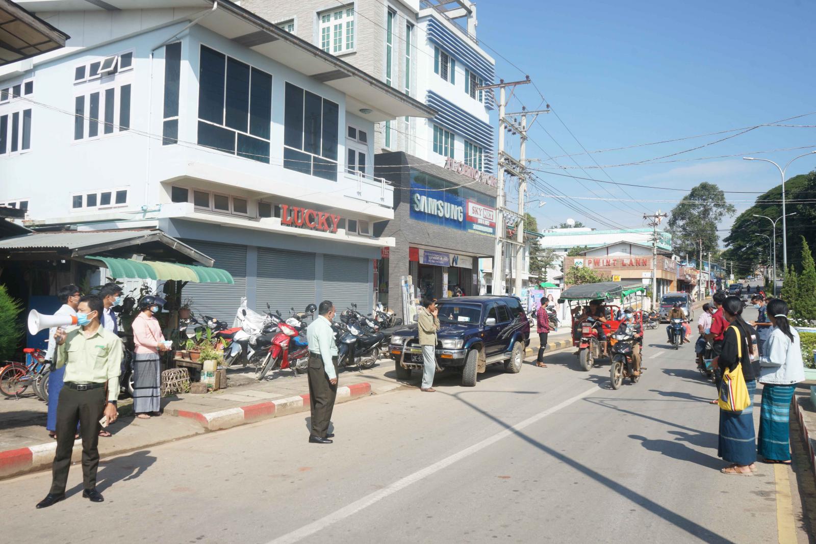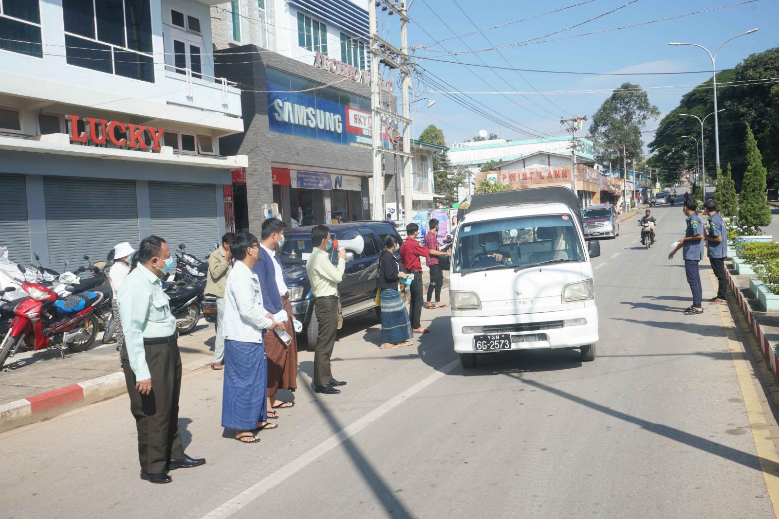 အဆိုပါကိုဗစ်-၁၉ ရောဂါကာကွယ်ရေးဆိုင်ရာ လက်ကမ်းစာစောင်များနှင့် နှာခေါင်းစည်း (Mask)များ အခမဲ့ဖြန့်ဝေခြင်းကို မြို့နယ်စီမံအုပ်ချုပ်ရေးအဖွဲ့ဥက္ကဋ္ဌ ၊ မြို့နယ်ကိုဗစ်-၁၉ ရောဂါထိန်းချုပ်ရေးနှင့် အရေးပေါ်တုံ့ပြန်ရေးကော်မတီ ဥက္ကဋ္ဌဦးမျိုးကျော်နှင့်ကော်မတီအဖွဲ့ဝင် မြို့နယ်အဆင့်ဌာနဆိုင်ရာများ ၊ လူမှုရေးအသင်းအဖွဲ့များပူးပေါင်း၍ “အပြင်ထွက်ပါက နှာခေါင်းစည်း(Mask)များကို တပ်ဆင်ကြရန်၊ ကိုဗစ်-၁၉ ရောဂါကာကွယ်ရေးနည်းလမ်းများနှင့်အညီ သွားလာနေထိုင်ကြရန်နှင့် တစ်ဦးတစ်ယောက်ချင်းစီအလိုက် မိမိတို့၏ကျန်းမာရေး အသိစိတ်များနှင့်အညီ ရောဂါကူးစက်မှုမရှိရေး သတိပြုနေထိုင်ကြရန်” အစရှိသည့် ကျန်းမာရေးဝန်ကြီးဌာန၏ သတိပေးနှိုးဆော်မှုများကို Hand Speaker ဖြင့် အသိပေးနှိုးဆော်ခဲ့ပြီး လမ်းသွားလမ်းလာနှင့် ဈေးသွားဈေးလာ ပြည်သူများကို နှာခေါင်းစည်း(Mask)များအခမဲ့ဖြန့် ဝေပေးခဲ့ကြောင်းနှင့် ကိုဗစ်-၁၉ ရောဂါကာကွယ်ရေးဆိုင်ရာသတိပေးနှိုးဆော်မှုများကို စဉ်ဆက်မပြတ် ဆက်လက်ဆောင်ရွက် သွားမည်ဖြစ်ကြောင်း သိရသည်။