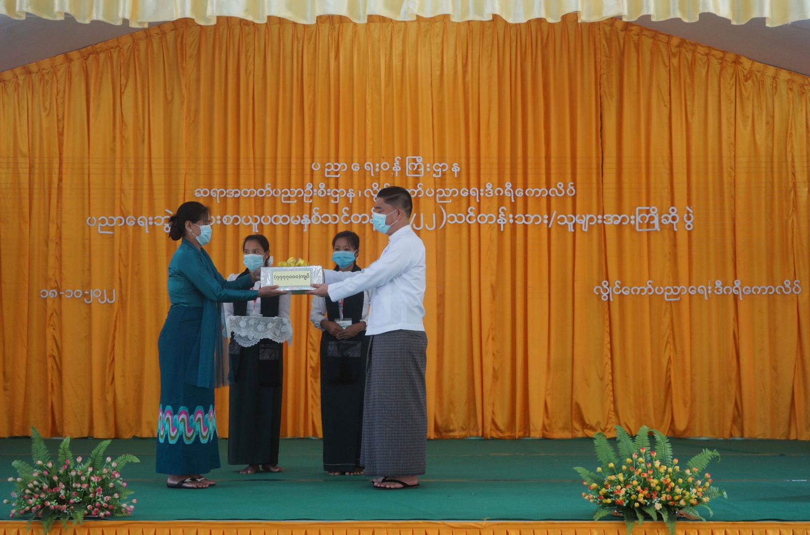 ထို့နောက် ပြည်နယ်ဝန်ကြီးချုပ်က သင်တန်းသား၊ သင်တန်းသူဆရာ၊ ဆရာမများ၏ ကျွေးမွေးစရိတ်အတွက် ထပ်ဆောင်းထောက်ပံ့ငွေများကို ပေးအပ်ခဲ့ရာ လွိုင်ကော်ပညာရေး ဒီဂရီကောလိပ်ကျောင်းအုပ်ကြီး ဒေါ်ချယ်ရီထွန်းက လက်ခံရယူခဲ့ပြီး ပြည်နယ်ဝန်ကြီးချုပ်နှင့် တာဝန်ရှိသူများက သင်တန်းသား၊ သင်တန်းသူများအား ရင်းရင်းနှီးနှီးတွေ့ဆုံ နှုတ်ဆက်အားပေးစကား ပြောကြားခဲ့သည်။