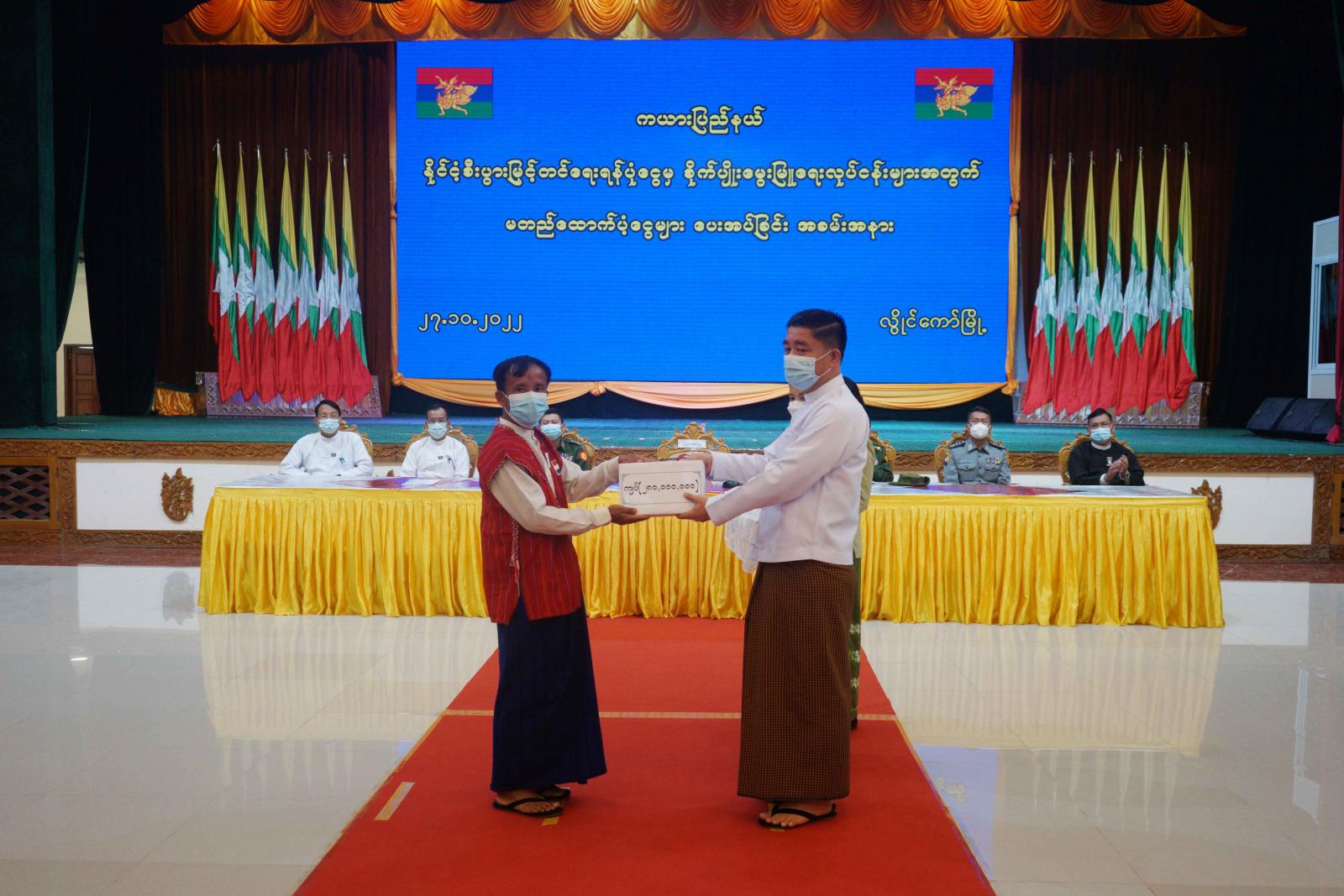 ယနေ့အခမ်းအနားတွင် ကယားပြည်နယ် နိုင်ငံ့စီးပွားမြှင့်တင်ရေးရန်ပုံငွေမှ ပြည်နယ်အတွင်းရှိ စိုက်ပျိုးရေးလုပ်ငန်းလုပ်ကိုင်သူ တောင်သူပေါင်း (၆၃)ဦးအတွက် ချေးငွေကျပ် (၃၈.၈)သန်း၊ မွေးမြူရေးလုပ်ငန်းရှင်(၆၀)ဦးအတွက် ချေးငွေကျပ်(၄၀၉.၀၅)သန်း၊ သမဝါယမအသင်း (၁၄)သင်းအတွက် ချေးငွေကျပ်(၂၈၀)သန်း စုစုပေါင်း(၇၂၇.၈၅)သန်းကို လုပ်ငန်းရှင် တောင်သူများထံ လက်ဝယ်အရောက် မတည်ထောက်ပံ့ငွေများ ပေးအပ်ခဲ့ကြောင်း သိရသည်။