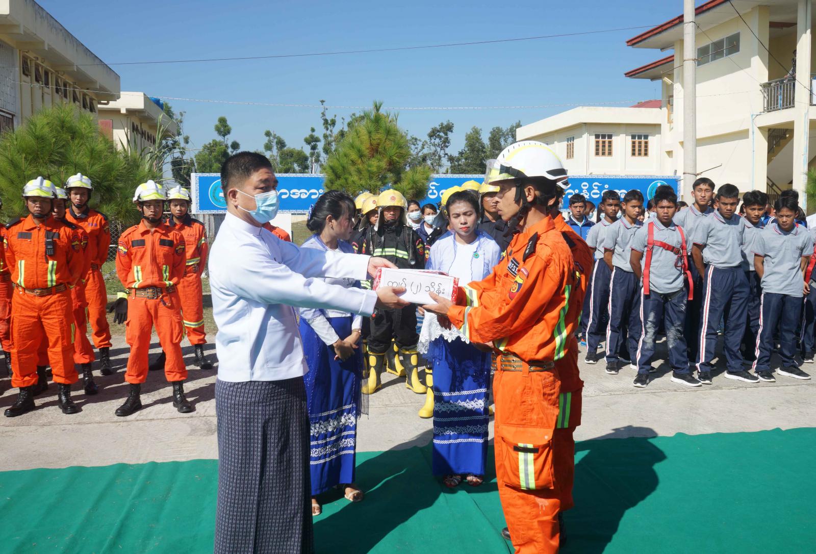 ယင်းနောက် ပြည်နယ်ဝန်ကြီးချုပ်က ငလျင်ဘေးအန္တရာယ်သဏ္ဍာန်တူ ဇတ်တိုက်လေ့ကျင့်မှုများ အပေါ်တွင် ဖြည့်စွက်ဆောင်ရွက်ရမည့် လုပ်ငန်းလိုအပ်ချက်များ၊ ပြည်သူများကို ဆက်လက် အသိပညာပေး ဆောင်ရွက်ရမည့်လုပ်ငန်းများကို ပြန်လည်သုံးသပ်လမ်းညွှန်မှာကြားပြီး ဇာတ်တိုက် လေ့ကျင့်မှုများတွင် ပါဝင်ခဲ့သော မီးသတ်တပ်ဖွဲ့ဝင်များ၊ လူမှုရေးအသင်းအဖွဲ့များနှင့် ပါဝင်ကူညီ ဆောင်ရွက်ခဲ့သူများကို ဂုဏ်ပြုချီးမြှင့်ငွေများ ပေးအပ်ခဲ့ကြောင်း သိရသည်။