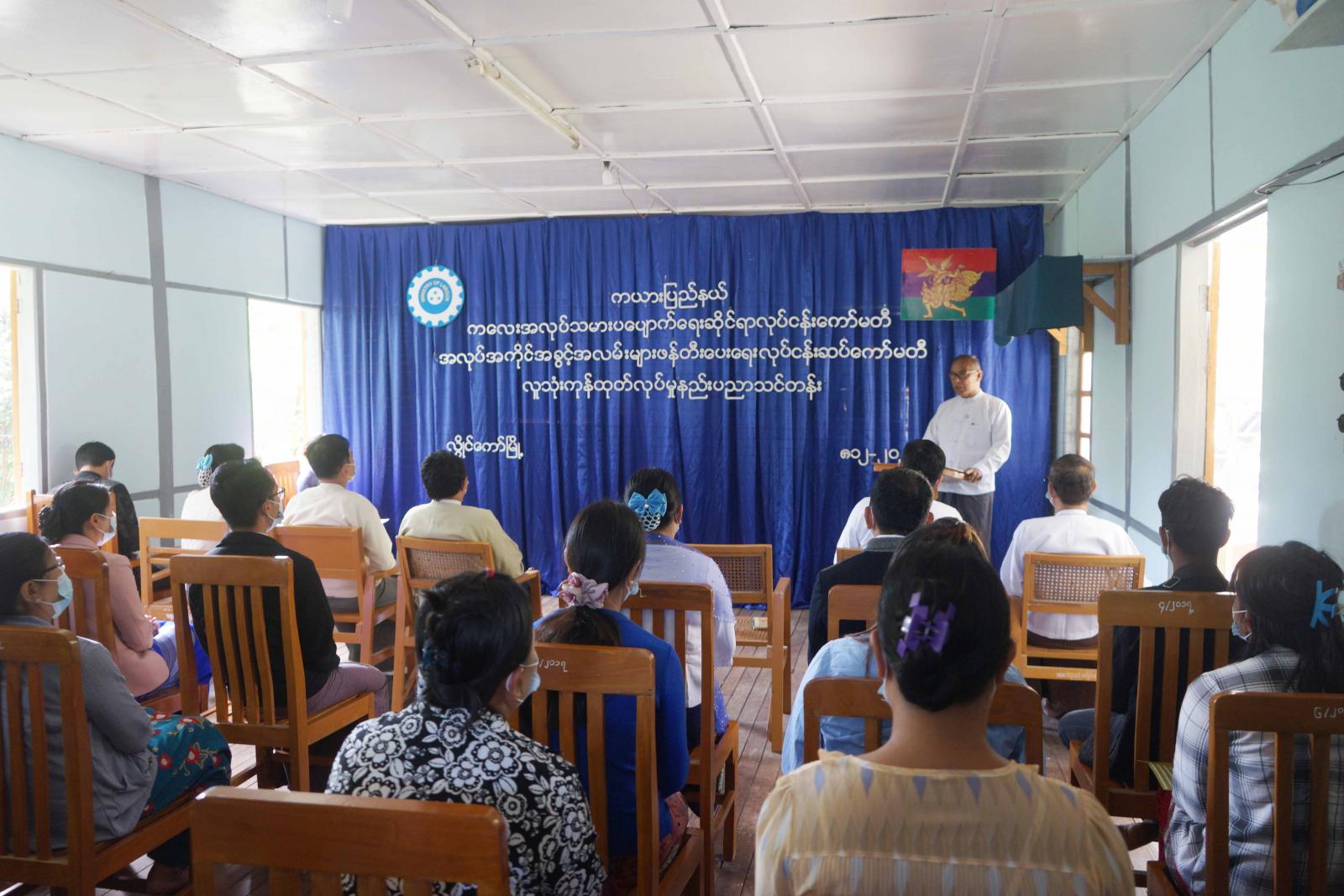 ကယားပြည်နယ်၊ ကလေးအလုပ်သမား ပပျောက်ရေးဆိုင်ရာ အလုပ်အကိုင်အခွင့်လမ်းများ ဖန်တီးပေးရေး လုပ်ငန်းဆပ်ကော်မတီ၏ လူသုံးကုန်ထုတ်လုပ်မှု နည်းပညာသင်တန်းဖွင့်ပွဲ အခမ်းအနားကို ယနေ့ နံနက်ပိုင်းက လွိုင်ကော်မြို့၊ အလုပ်သမားညွှန်ကြားရေးဦးစီးဌာန၌ ကျင်းပရာ ပြည်နယ်အဆင့်ဌာနဆိုင်ရာများ၊ လွိုင်ကော်မြို့နယ် စီမံအုပ်ချုပ်ရေးအဖွဲ့ဥက္ကဋ္ဌ၊ ဆပ်ကော်မတီဝင်များ၊ သင်တန်းဆရာများနှင့် သင်တန်းသား၊ သင်တန်းသူများ တက်ရောက်ခဲ့ကြသည်။