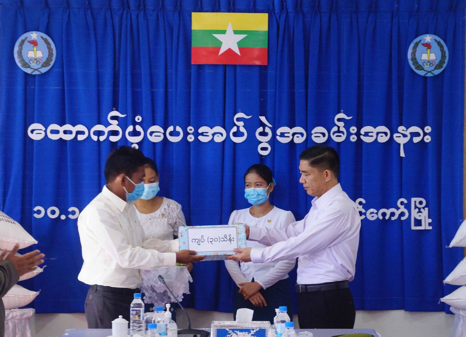 ထို့နောက် ပြည်နယ်ဝန်ကြီးချုပ်က ဘောလုံး၊ ပြေးခုန်ပစ်၊ ဂျူဒို၊ တိုက်ကွမ်ဒို၊ အားကစား နည်းများမှ သင်တန်းသား၊ သင်တန်းသူများကို တစ်ဦးချင်း အခက်အခဲများကိုမေးမြန်းပြီး အားပေးစကားပြောကြားကာ ထောက်ပံ့ငွေနှင့် ဆန်များကိုပေးအပ်ရာ ဒုတိယကျောင်းအုပ် ဦးဇော်မင်းထွေးက လက်ခံရယူခဲ့ သည်။