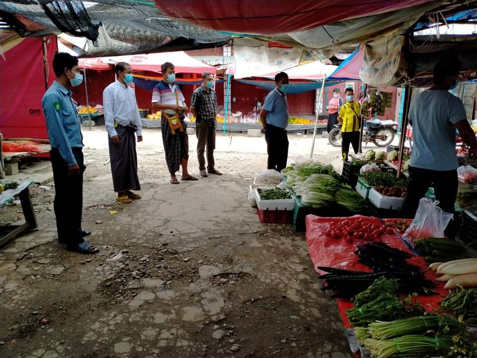 မြို့ကိုဗစ်၁၉ကာကွယ်၊ထိန်းချုပ်၊ကုသရေးကော်မတီဉက္ကဌ၊ မြို့အုပ်ချုပ်ရေးမှူးဦးမျိုးလွင်၊ စည်ပင်သာယာရေး ဦးစီးမှူးဦးမျိုးသူရကျော်နှင့်ဌာဆိုင်ရာများ၊ ရပ်ကွက် အုပ်ချုပ်ရေးမှူးများပူးပေါင်း၍ ကုန်စိမ်းဈေးဆိုင်များ၌ ကုန်စိမ်းများရောင်းချမှုအခြေအနေကို လိုက်လံစစ်ဆေးပြီး လိုအပ်သည်များကို လမ်းညွှန်မှာကြား သည်။