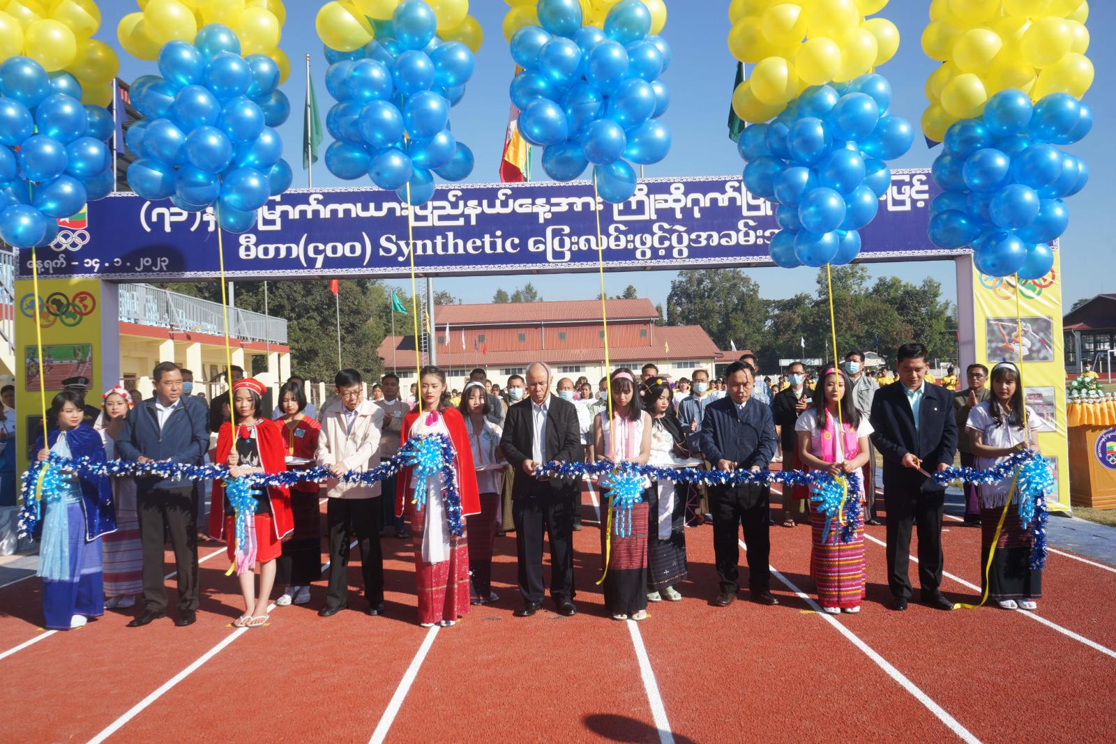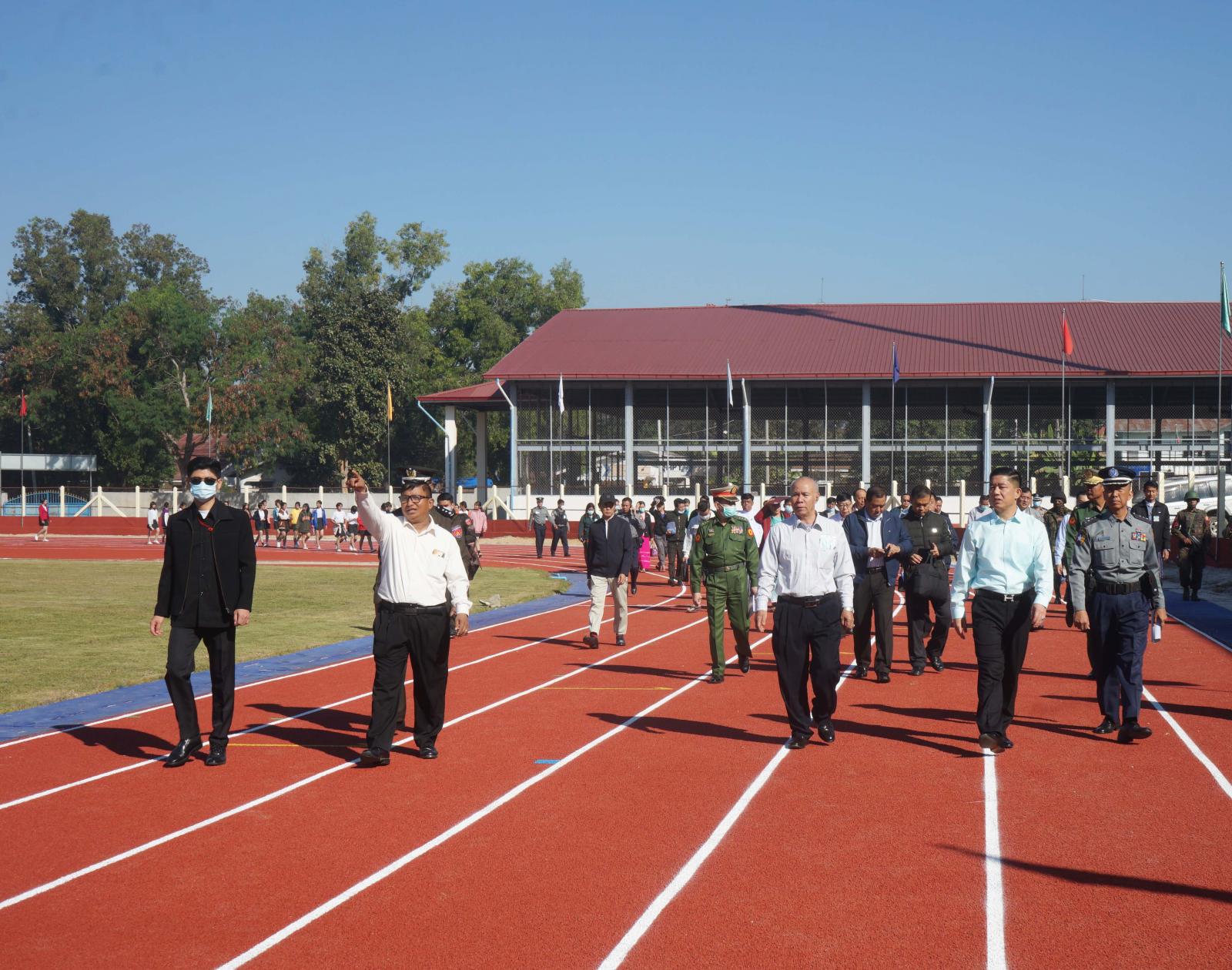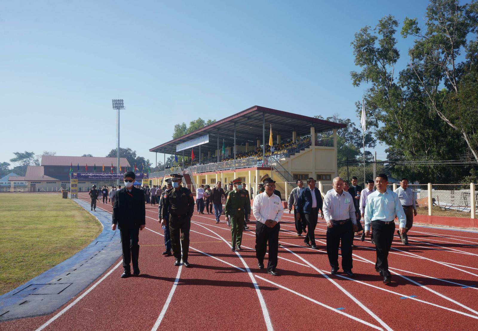 ထို့နောက် မီတာ(၄၀၀)Synthetic ပြေးလမ်းအား နိုင်ငံတော်စီမံအုပ်ချုပ်ရေးကောင်စီ အဖွဲ့ဝင်များ၊ ပြည်ထောင်စုဝန်ကြီးများနှင့် ပြည်နယ်ဝန်ကြီးချုပ်တို့က ဖဲကြိုးဖြတ်ဖွင့်လှစ်ပေးပြီး အခမ်းအနားသို့ တက်ရောက်လာကြသည့် ဌာနဆိုင်ရာများ၊ တိုင်းရင်းသားရိုးရာယဉ်ကျေးမှုအဖွဲ့များ၊ အားကစားသမား များနှင့်အတူ မှတ်တမ်းတင်ဓာတ်ပုံရိုက်ပြီး မီတာ(၄၀၀) ပြေးလမ်းနှင့်အားကစားကွင်းအား ဖြတ်သန်း ကြည့်ရှုကြသည်။