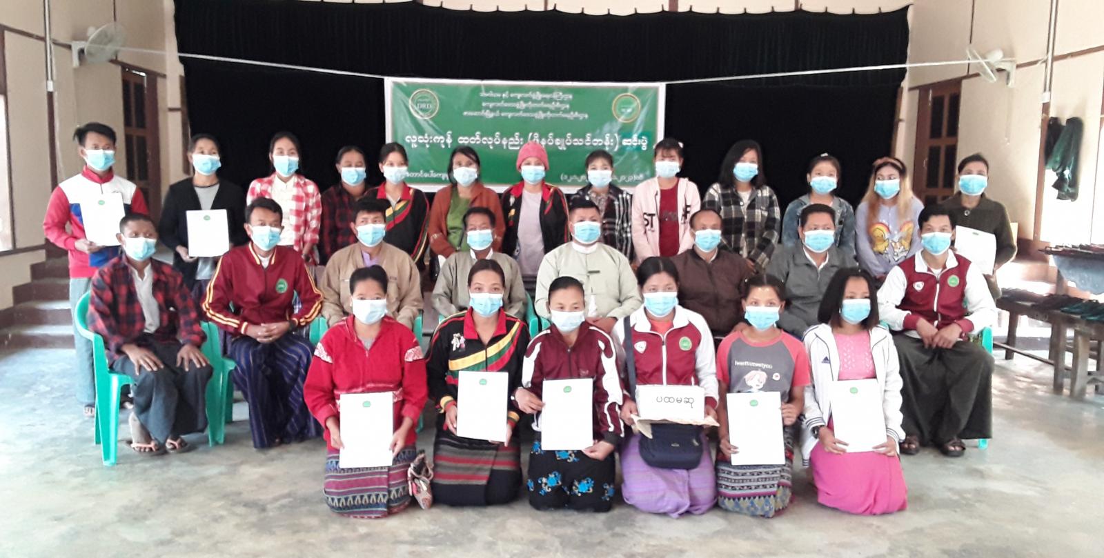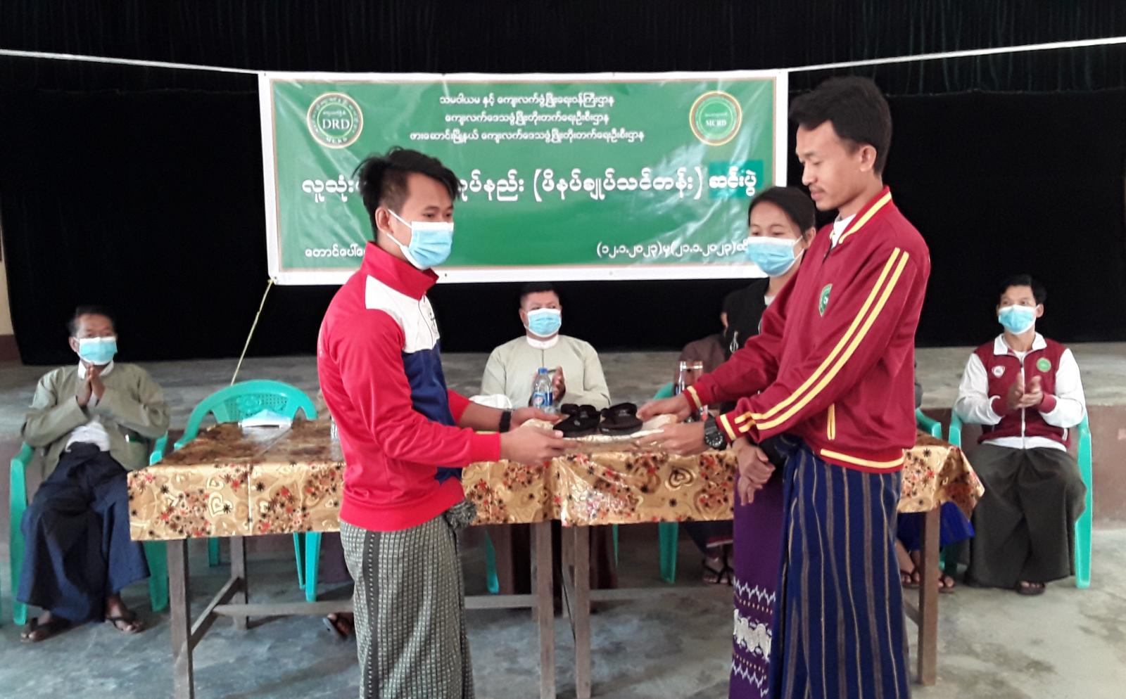ဆက်လက်၍ သင်တန်းတွင် ဆုရရှိသူများအား ဆုများနှင့်သင်တန်းဆင်းလက်မှတ်များကို မြို့နယ်အုပ်ချုပ်ရေးမှူး ဦးသက်မြင့်ဦး၊ ဘောလခဲခရိုင် ကျေးလက်ဒေသဖွံ့ဖြိုးတိုးတက်ရေးဦးစီးဌာန၊ ခရိုင်ဦးစီးမှူးဦးစံမြနှင့် တာ၀န်ရှိသူများက ချီးမြှင့်ပေးအပ်ခဲ့ကြောင်းနှင့် သင်တန်းသူများချုပ်လုပ်ထားသည့် ဖိနပ်များအား တာဝန်ရှိသူများက ကြည့်ရှုအားပေးခဲ့ကြောင်းသိရသည်။