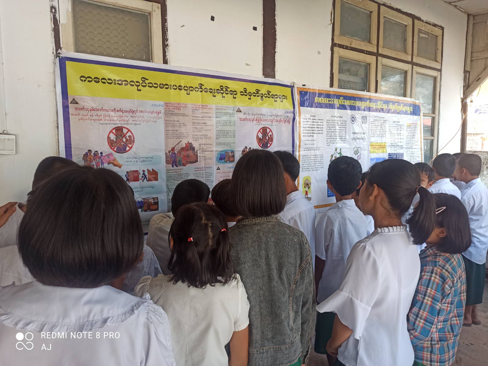 ထို့နောက် တက်ရောက်လာကြသည့် ကျောင်းသူကျောင်းသားများသည် ခရိုင်ပြန်ဆက်ဦးစီးဌာနမှ ပြသထားသည့် ကလေးအလုပ်သမားပပျောက်ရေးနှင့် ကလေးသူငယ်အခွင့်အရေးဆိုင်ရာ အသိပညာပေးနံရံကပ်စာစောင်များနှင့် စာအုပ်စာစောင်များကို ဖတ်ရှုလေ့လာခဲ့ကြသည်။ အဆိုပါ အသိပညာပေးဟောပြောပွဲနှင့် နံရံကပ်စာစောင်ပြပွဲသို့ အမက(၁၃)ကျောင်းမှ မူလတန်း ကျောင်းသူ၊ ကျောင်းသားများ တက်ရောက်ကြကြောင်းသိရသည်။